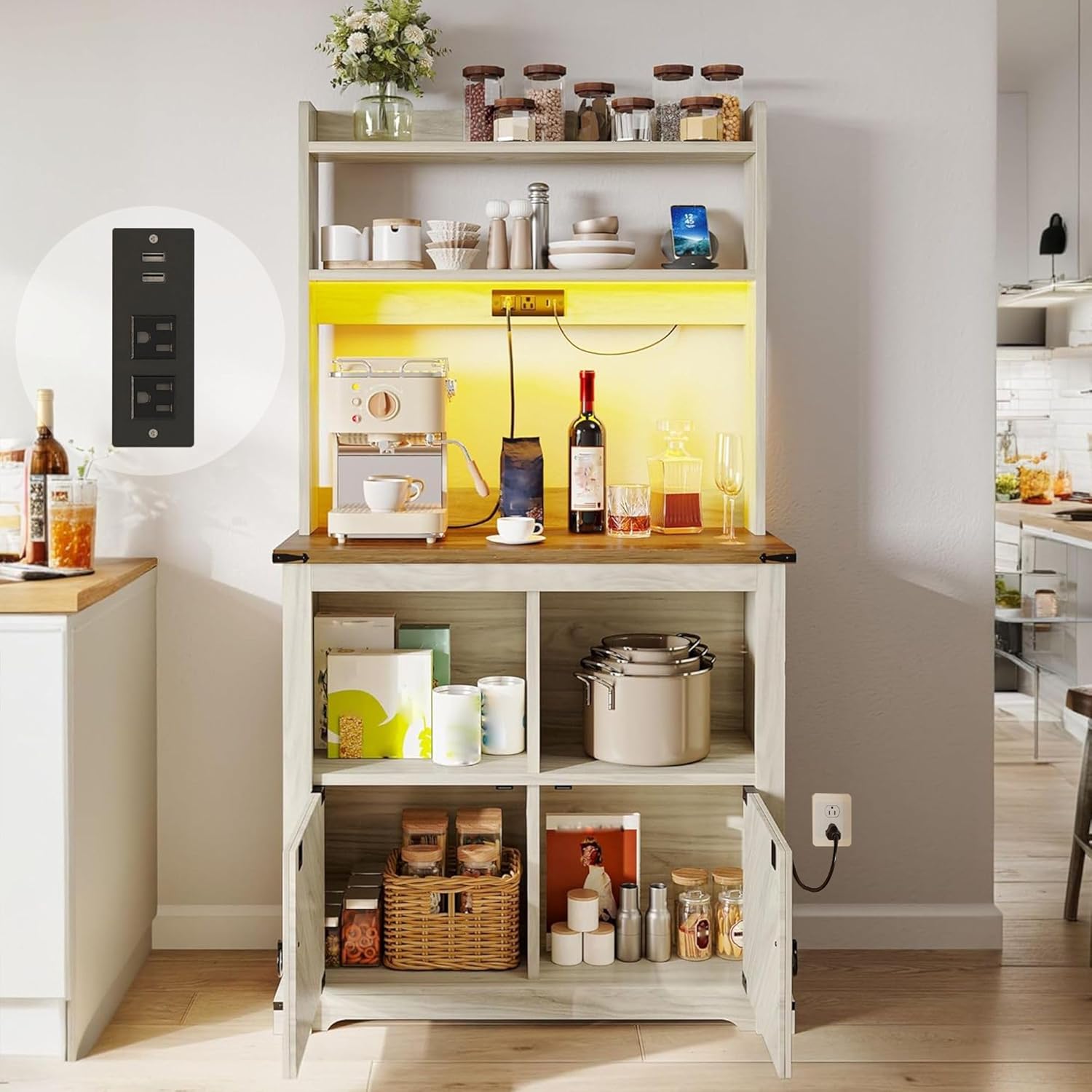 - Bakers Rack with Power Outlets: Our coffee bar cabinet has 2 AC outlets and 2 USB ports to power your devices.If you are a coffee lover, you can plug in your coffee maker and learn and make your own coffee drinks