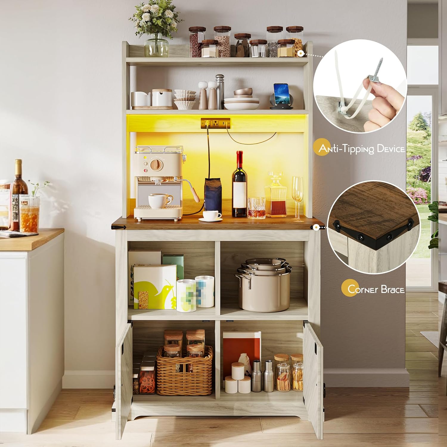- Seamless Assembly, Maximum Safety: Say goodbye to frustration! Our baker rack cabinet features straightforward instructions and pre-labeled parts for an easy setup. Plus, non-tipping kits ensure added safety, making your kitchen practical and secure