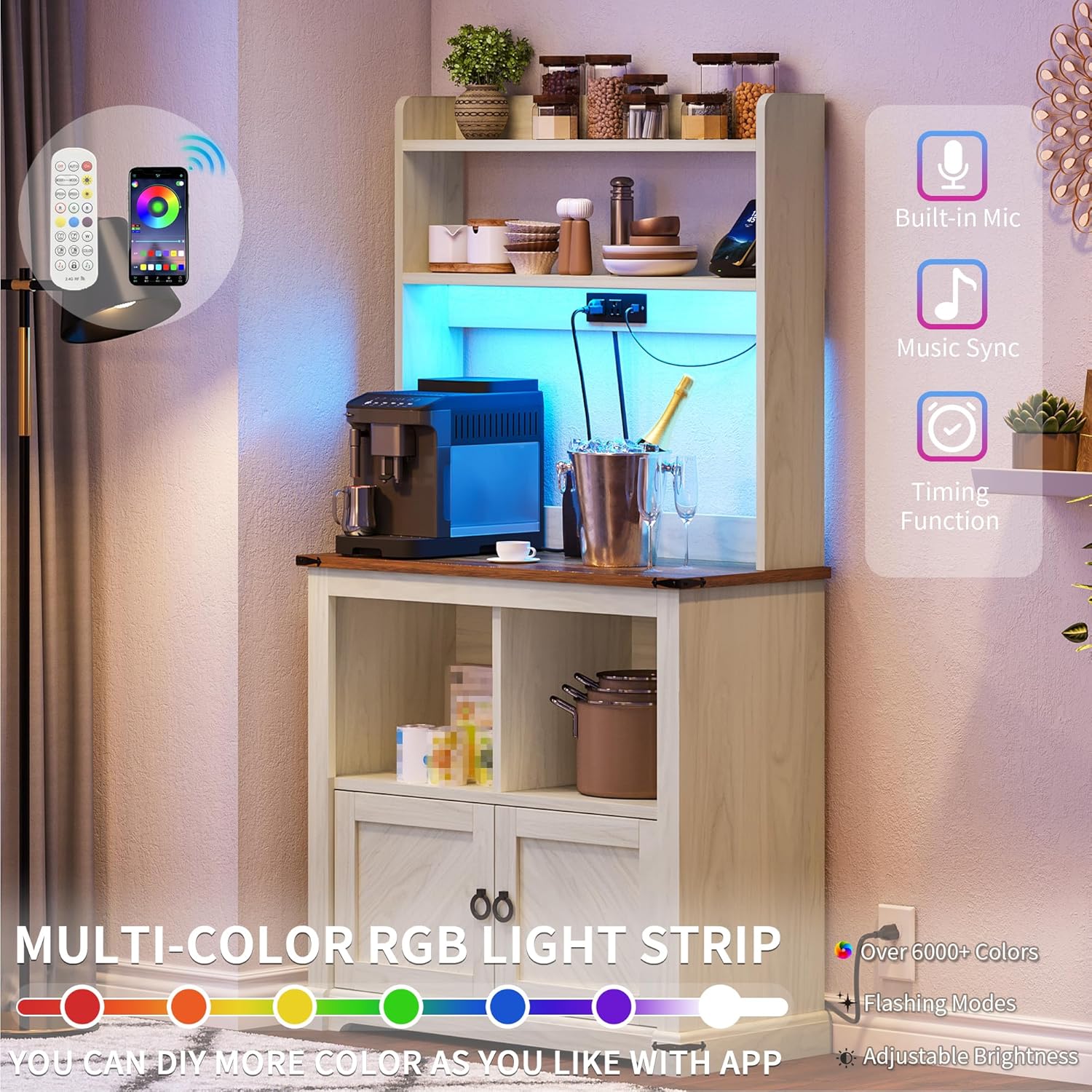 - Cool & Smart Led Light: The hutch cabinet with storage built-in RGB LED lights, controlled by remote or app, add a modern glow to your space and impress your guests.In addition to giving your space more ambiance, it helps you to make cabinets for nighttime use