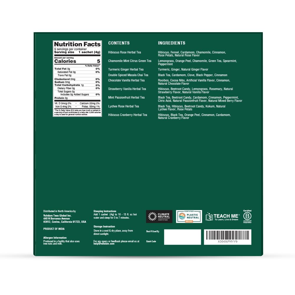 - 9 Unique Flavors in One Assortment – Enjoy a delightful variety including Hibiscus Rose, Chamomile Mint Citrus Green, Hibiscus Cranberry, Double Spiced Masala Chai, Strawberry Vanilla, Chocolate Vanilla, Mint Passionfruit, Lychee Rose, Turmeric Ginger, and Herbal blends.