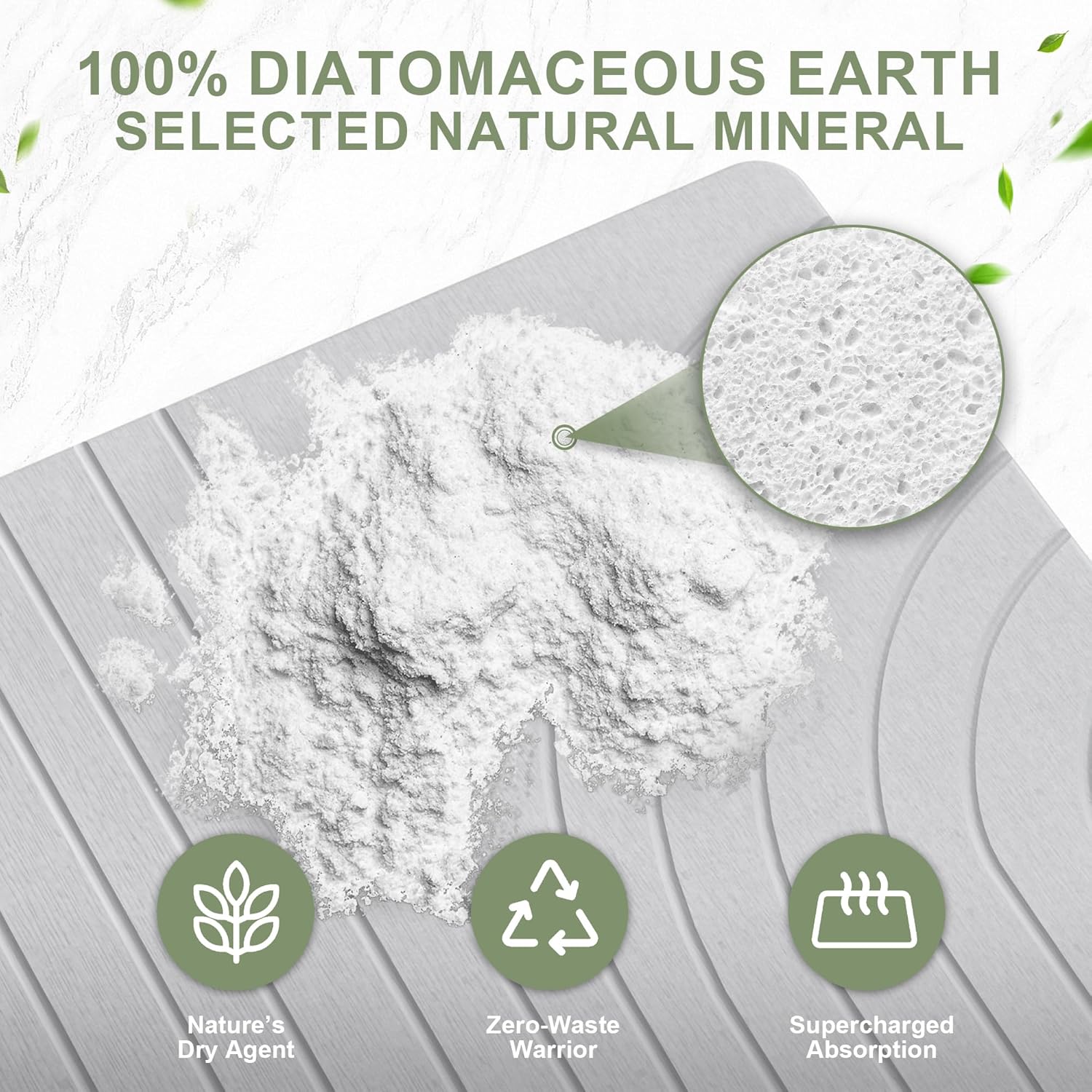 - [NATURAL DIATOMACEOUS EARTH DRYING MAT]:This stone dish drying mat is made of natural diatomaceous earth in the material, which is natural and environmentally friendly, non-toxic and safe. The stone drying mat lasts longer than traditional drying mats and ensures that your kitchen countertops are drier and tidier while in use.