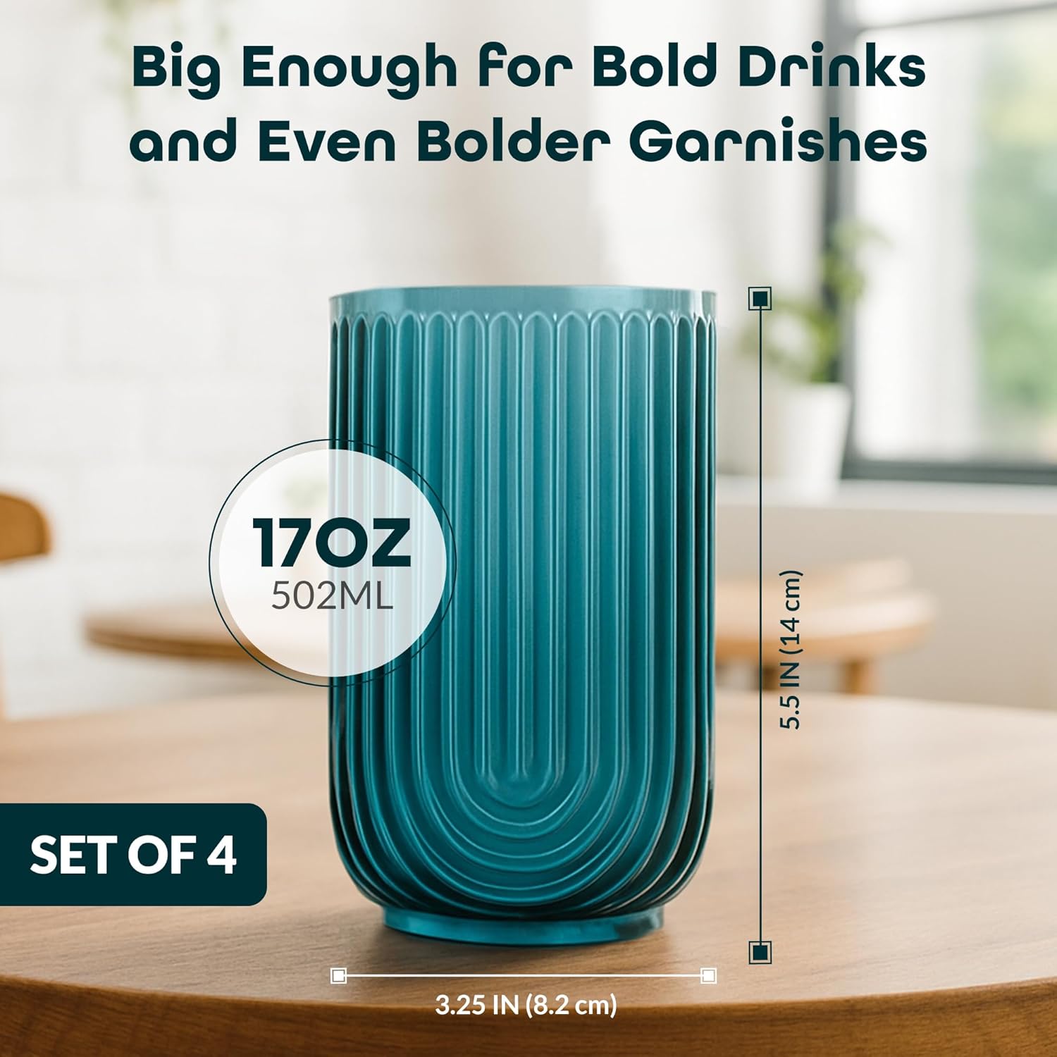 Glaver's Vintage Glassware Art Deco Highball Glasses Set of 4 Blush Ribbed Drinking Glasses 17 Oz U-Shape Arch Design Colored Cocktail Kitchen Tumblers Everyday Dinner Decorative Party, Blue