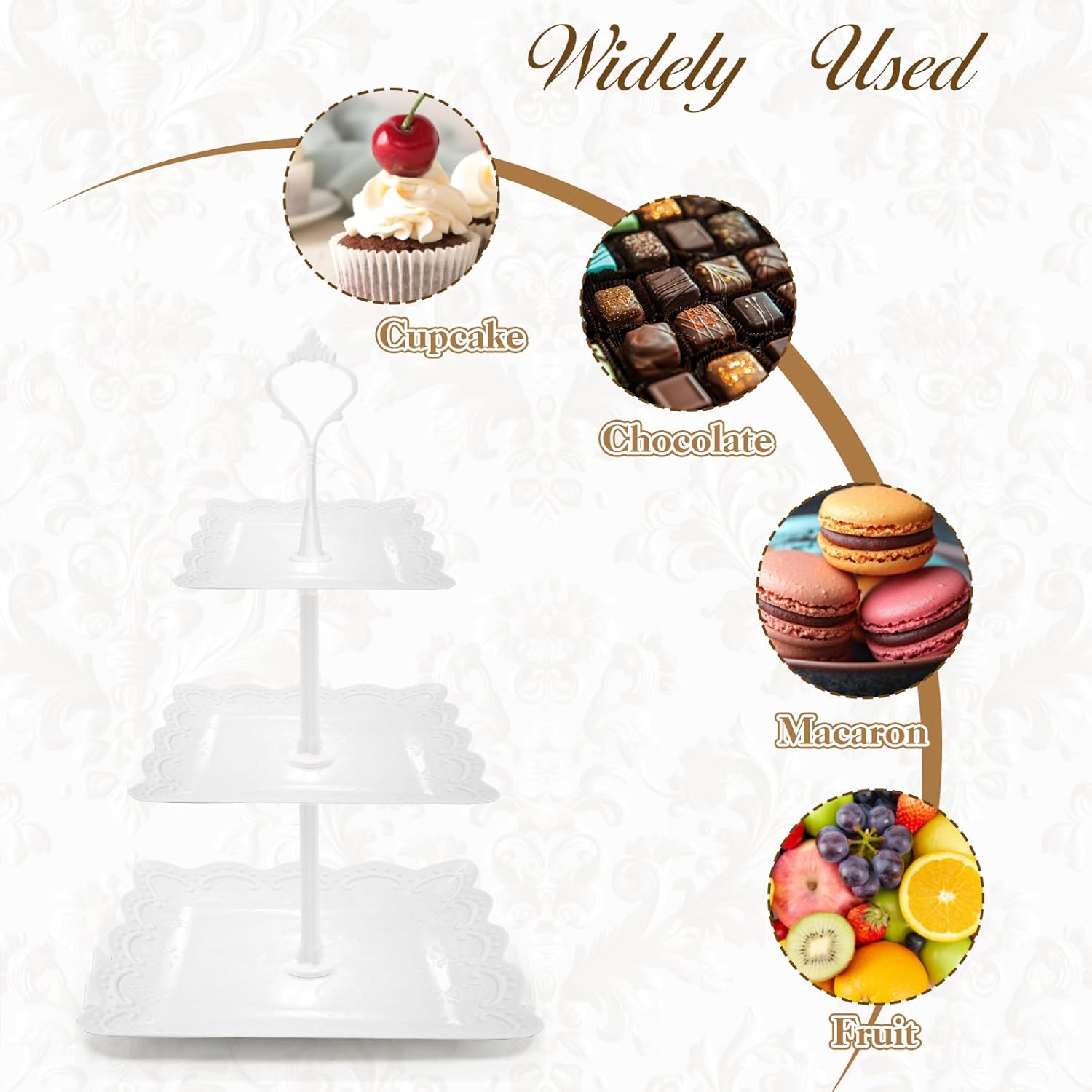 3 Tier Cupcake Stand, Durable Plastic 3 Tier Serving Tray for Cupcake, Fruit, Chocolate, Cookies, Square White Embossed Tiered Tray Stand for Wedding, Baby Shower, Party