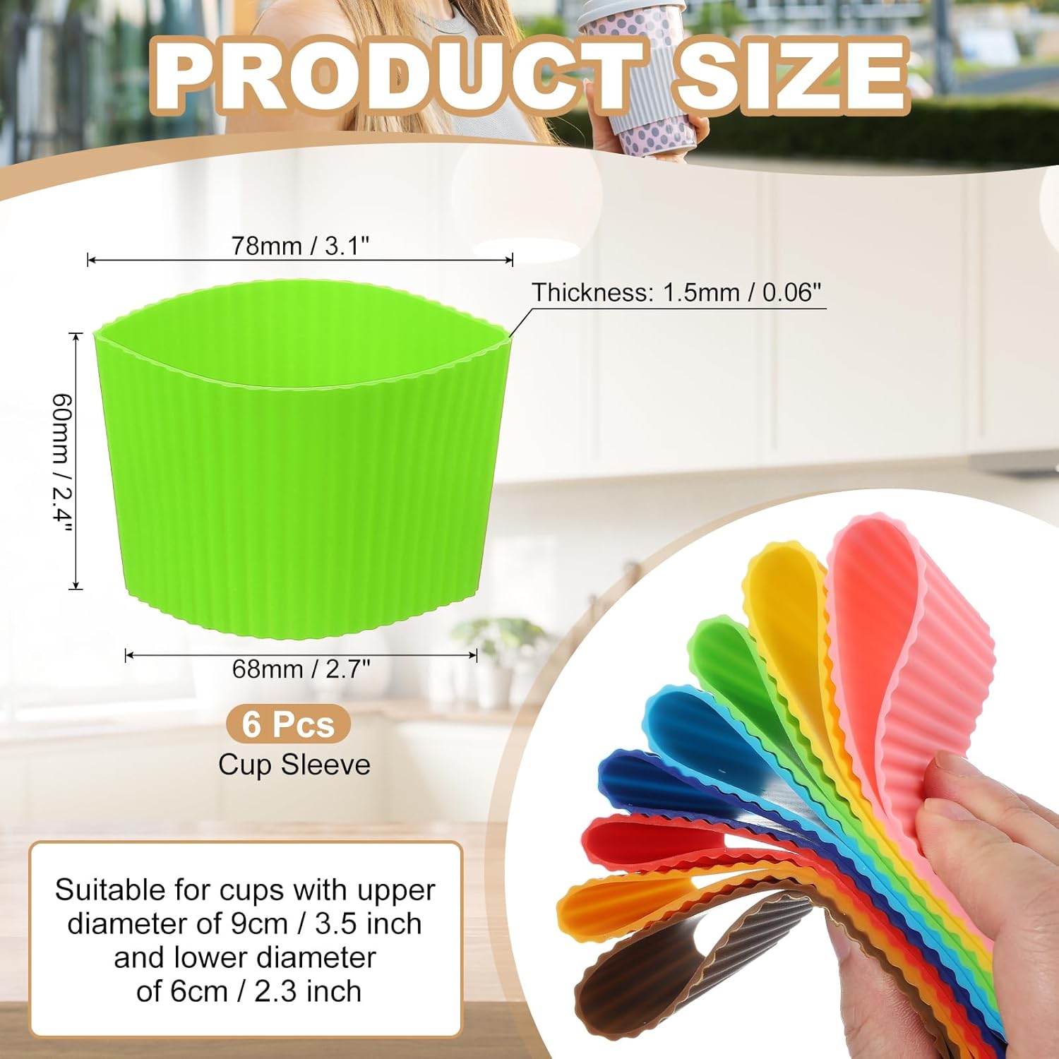- Specification: Color: Green; Material: Silicone; Style: Tapered Stripes; High: 60mm / 2.4 inch; Upper Diameter: 78mm / 3.1 inch; Lower Diameter: 68mm / 2.7 inch; Thickness: 1.5mm / 0.06 inch; Applicable Cup Upper Diameter: 9cm / 3.5 inch; Applicable Cup Lower Diameter: 6cm / 2.4 inch; Package Contents: 6 x Cup Sleeve