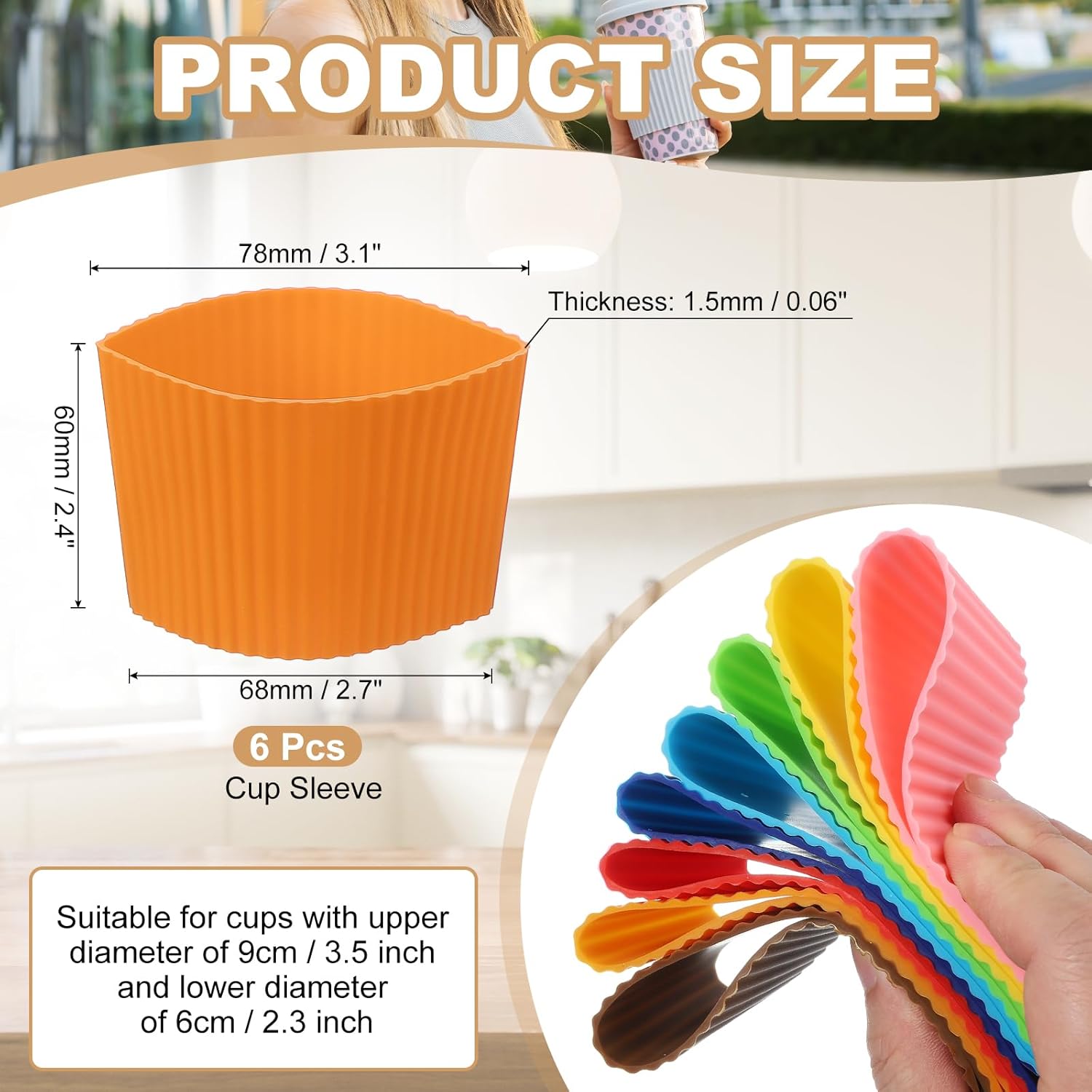 - Specification: Color: Orange; Material: Silicone; Style: Tapered Stripes; High: 60mm / 2.4 inch; Upper Diameter: 78mm / 3.1 inch; Lower Diameter: 68mm / 2.7 inch; Thickness: 1.5mm / 0.06 inch; Applicable Cup Upper Diameter: 9cm / 3.5 inch; Applicable Cup Lower Diameter: 6cm / 2.4 inch; Package Contents: 6 x Cup Sleeve