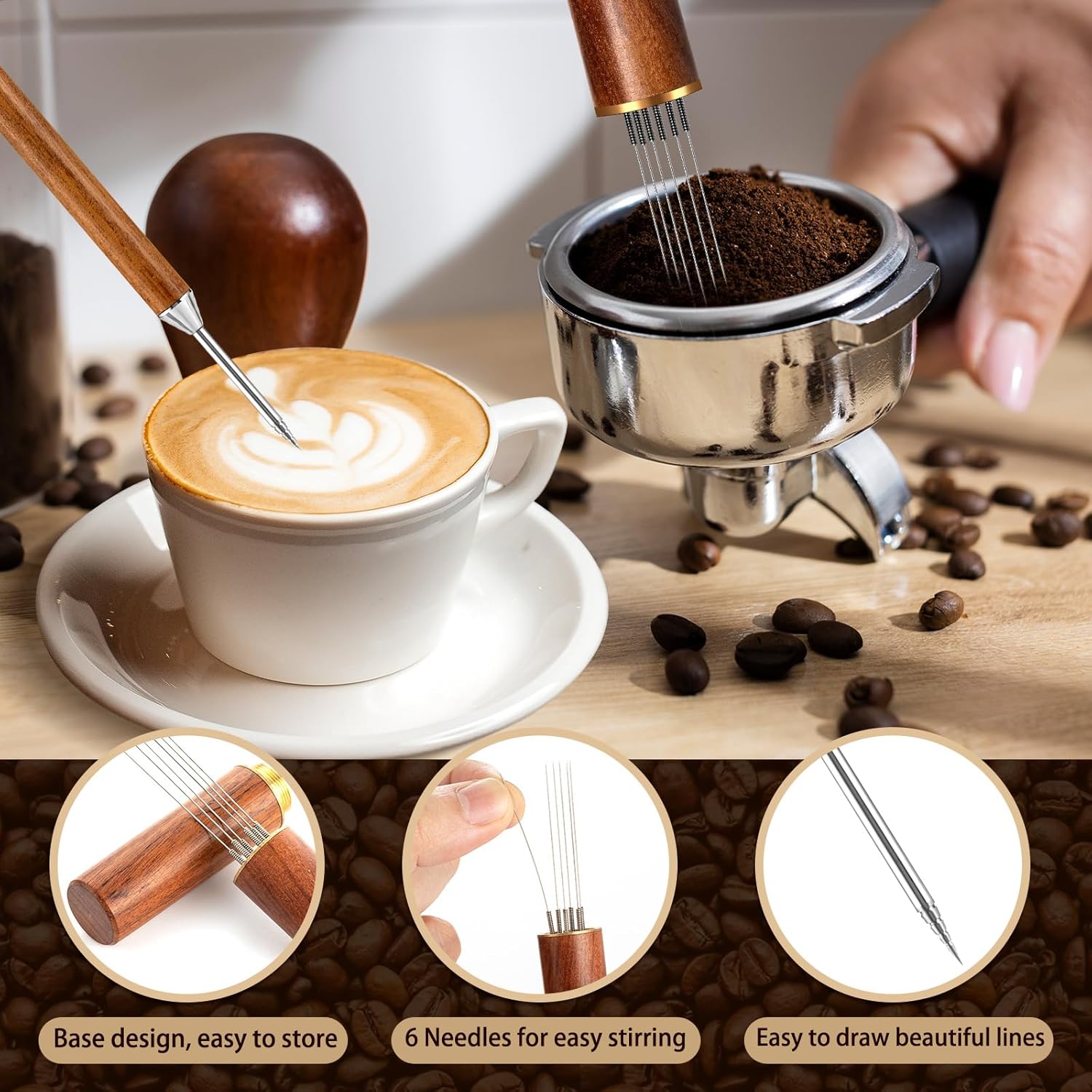 - Practical Set: You will receive an espresso stirrer and a coffee latte art pen. The coffee stirrer is equipped with 6 0.4mm fine needles, which can effectively break up coffee clumps, promoting more even extraction and better espresso. Featured with a latte art pen which can shape kinds of beautiful coffee patterns