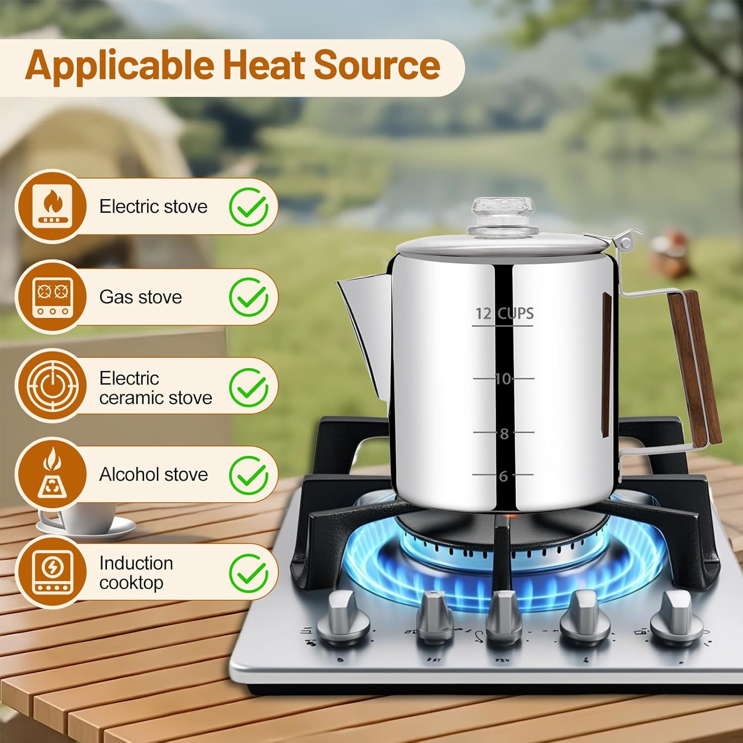 - Compatible with All Stovetops: Our percolator coffee pot is suitable for any stove, such as gas, induction stove, ceramic stove, electric stove, alcohol stove and propane camping stove. You don't need to go out, you can easily make your favorite lattes, mochas, smoothies, macchiatos and cappuccinos,. We use high quality ingredients to make the extraction hole to mellow the coffee and bring high quality coffee to you to enjoy