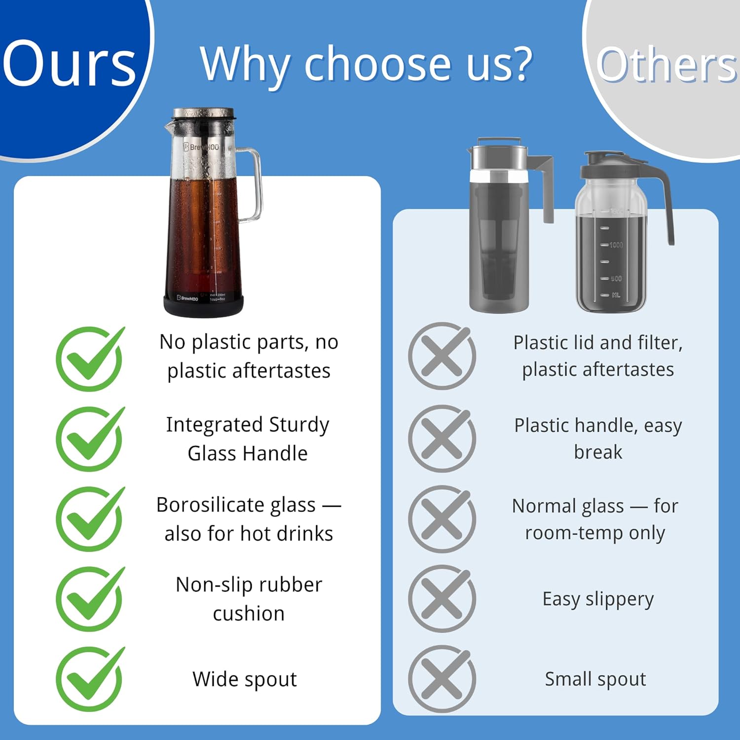 - [BREWMOO: BREW MOOD – SIMPLICITY MEETS PURE TASTE] BrewMOO, Brew Mood—cold brew should fit your rhythm, not disrupt it. Our Sleek Cold Brew Pitcher features a sleek tapered silhouette, sliding easily into tight spaces while adding a subtle touch of style to your kitchen. Made with borosilicate glass (durable, clear) and a 100um ultra-fine 304 stainless steel filter. We honor traditional cold brew (purest form) for an exceptional experience: silky-smooth sips, no plastic or chemical aftertastes—just the full, rich flavor of your beans.