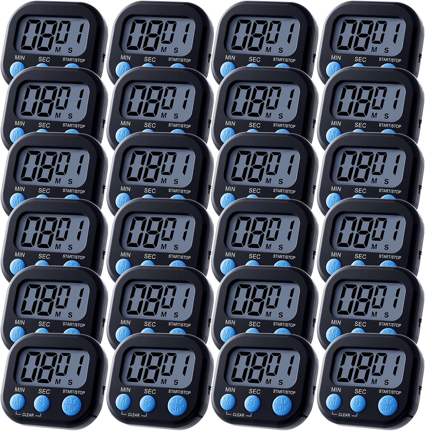 Leumoi 24 Pcs Digital Kitchen Timers Magnetic Back Timers Bulk Large Screen Loud Alarm On/Off Switch Minute Second Count up Countdown Memory Setting for Cooking Classroom Exercise(Black and Blue)