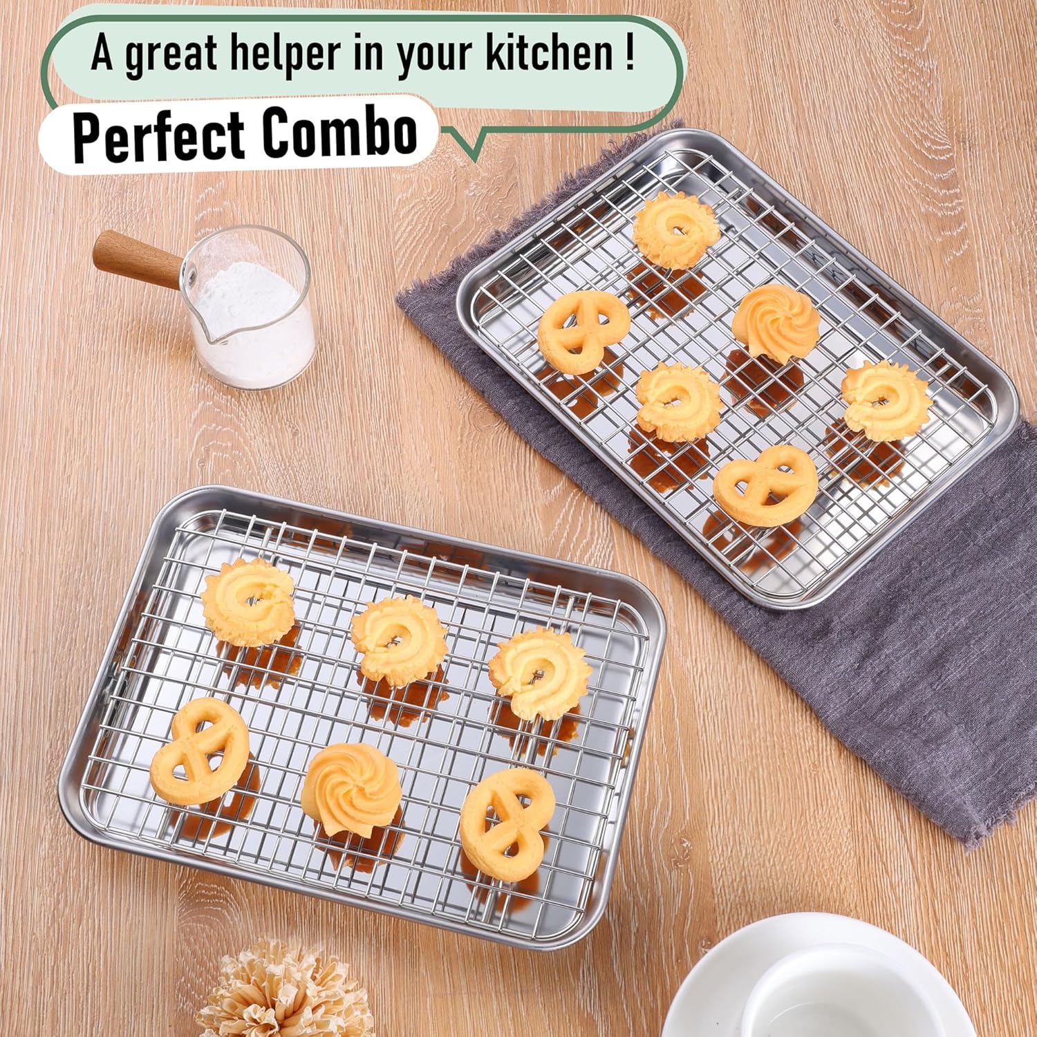 - Quality stainless steel, small baking sheet with rack set is made of pure food grade stainless steel without any coating or plating, no harmful substance into your food during high heat, rust and warp resistance enables durability for long lasting