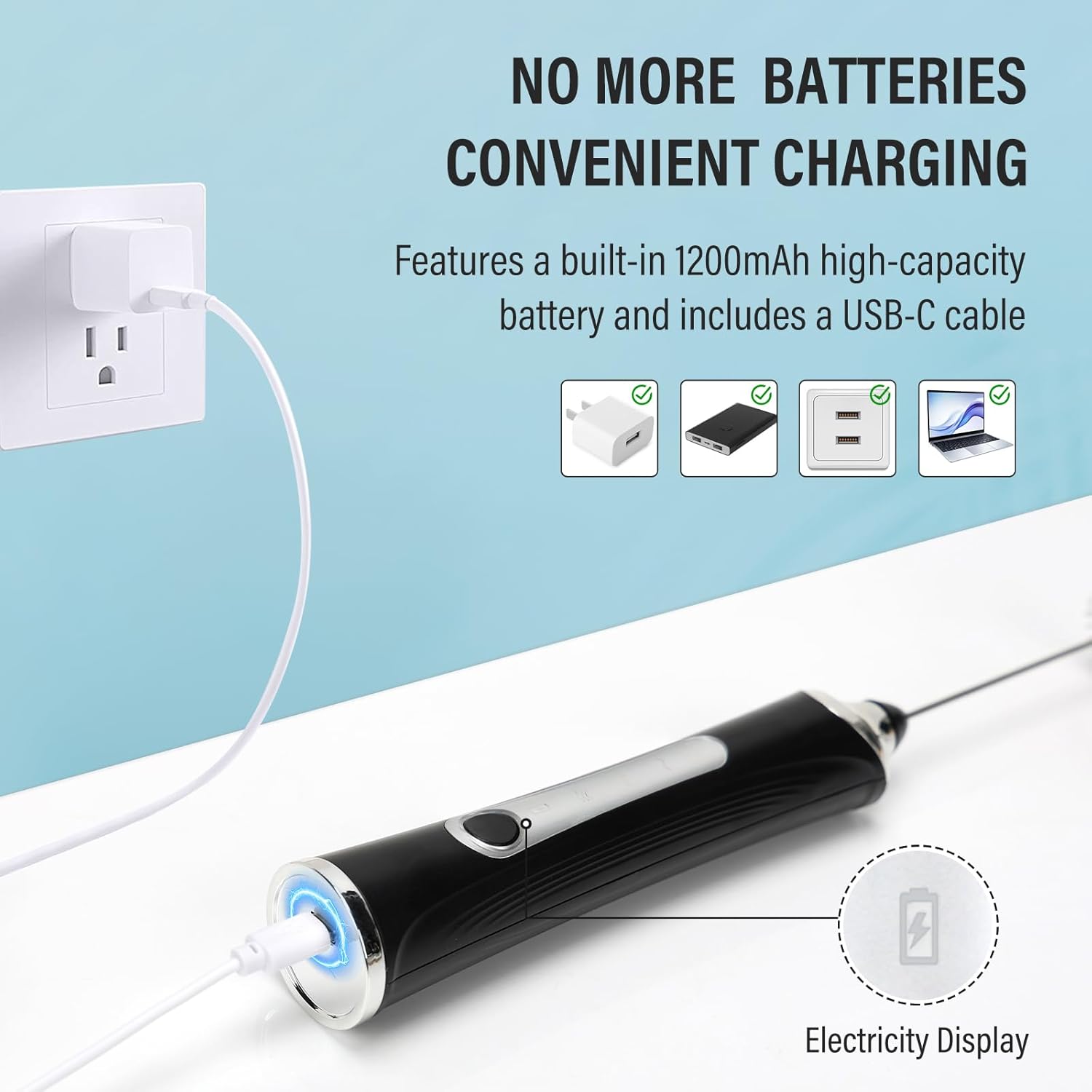 - USB-C Rechargeable Milk Frother: Unlike traditional battery-powered milk frothers, this rechargeable model features a 1200mAh lithium battery—eliminating the hassle of frequent battery replacements,Our rechargeable milk frother can be used for several months after being fully charged, each time.Our stirrers electric can easily make creamy foam for coffee and mix drinks noiselessly in 15-20 seconds, allowing you to enjoy silky drinks immediately