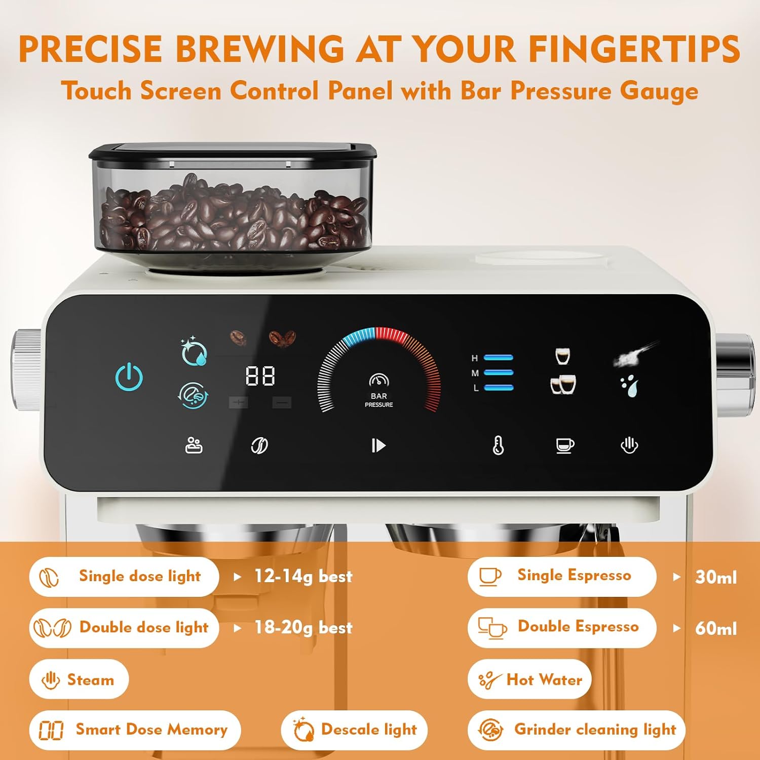 - Dose Control Espresso Machine: Pre-set dosing technology delivers exact coffee grounds per cup (single/double shots). Coffee Beans: 12-14g for one shot; 18-20g for double shots. Brewing Espresso: One shot is about 30ml; Double shot is about 60ml