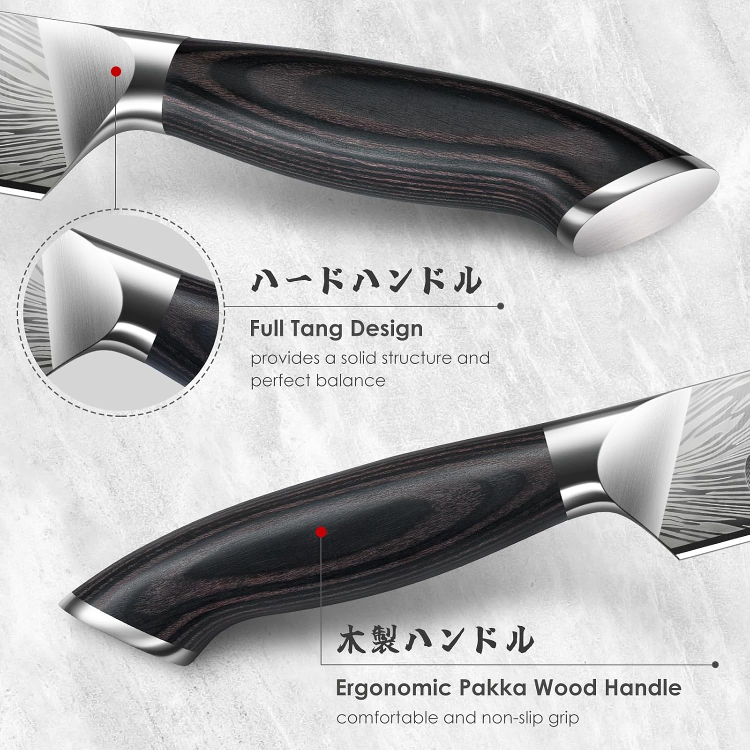- [Fashion Laser-Etched Professional Aesthetic] This professional meat cutting knife features a design that combines traditional aesthetics with modern elements. Engraving a stylish texture pattern on the blade's surface by laser makes knife look more advanced and fashional. NOTE: THIS IS NOT DAMASCUS KITCHEN KNIFE