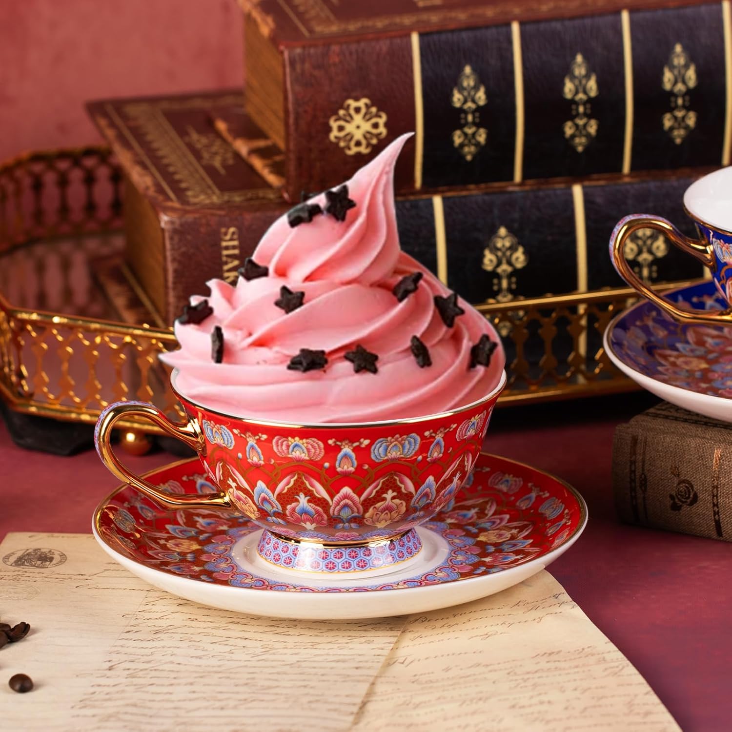 KAMMAK Tea Cups and Saucers Set of 2, Porcelain Coffee Cups with Saucer for Espresso, Cappuccino, 8oz Vintage Red and Blue Ceramic Demitasse Mug for Home, Tea Party, Office