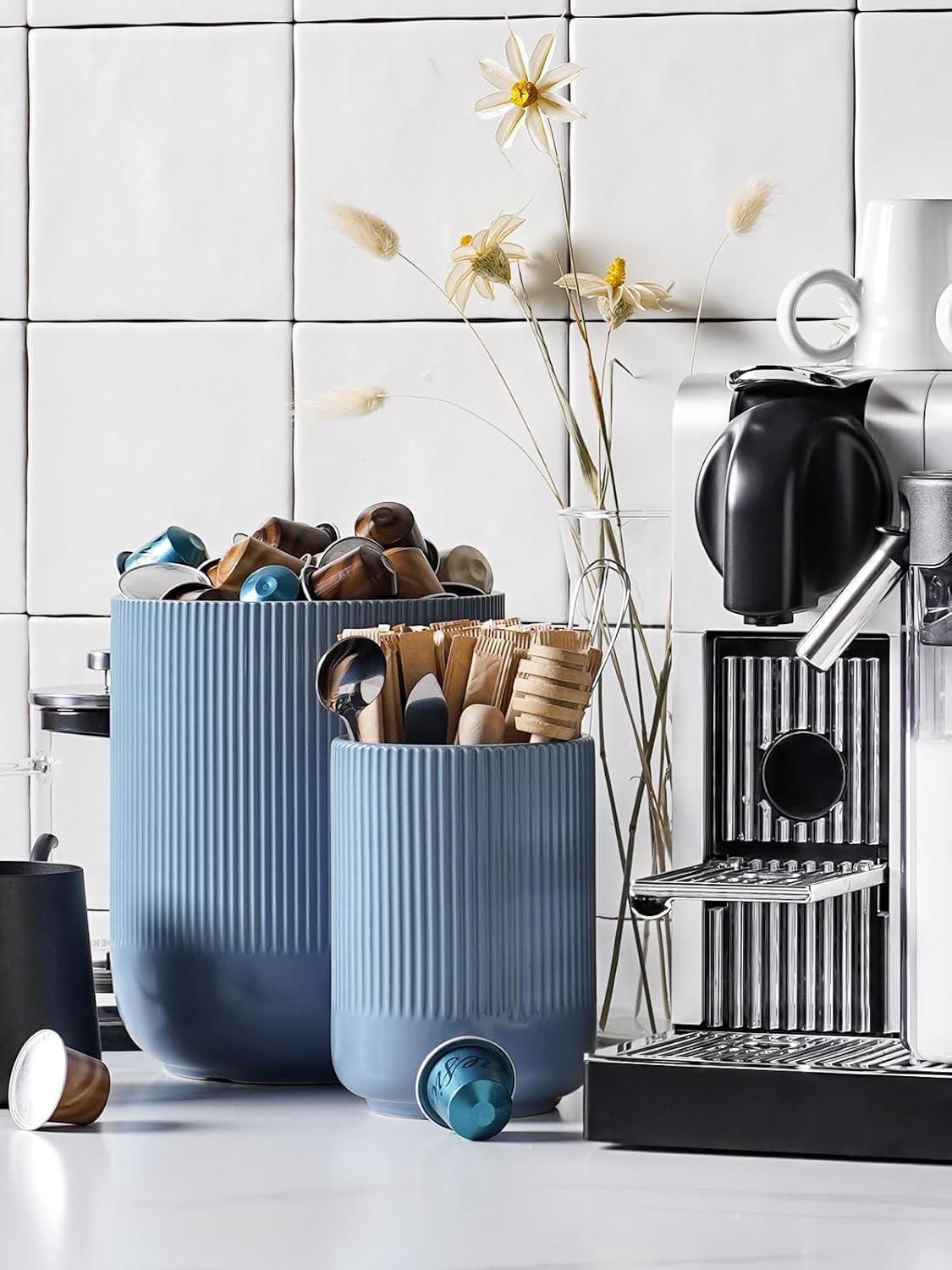 - Multi-Functional Utensil Holder: These kitchen utensil holders do more than just store cooking utensils; They also double as elegant vases, offering a stylish home for hair tools like combs, and can seamlessly house coffee pods and stirrers on your bar countertop; Their versatility knows no bounds