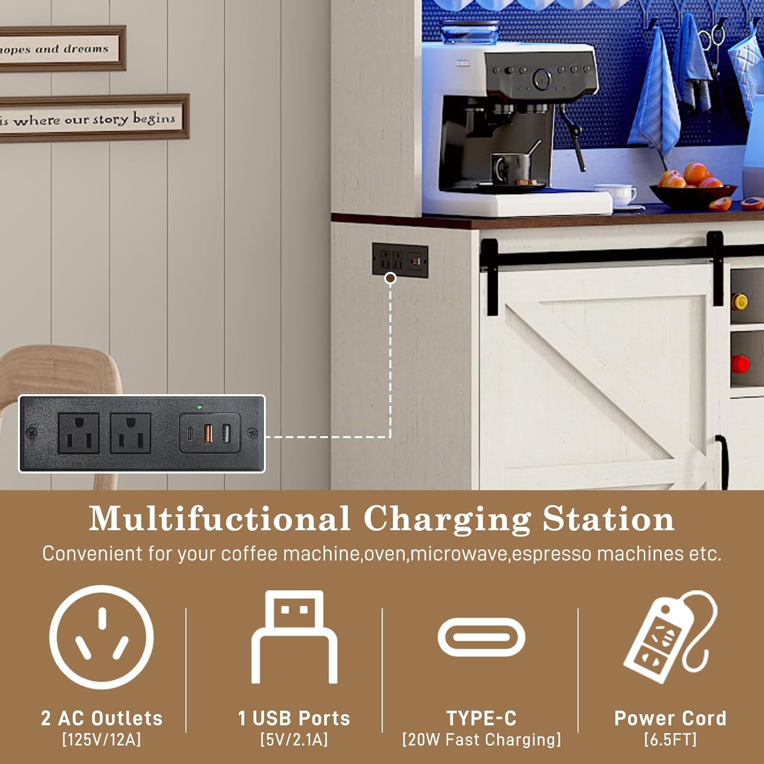 - 【Convenient Charging Sockets】 The Coffee bar cabinets comes with a built-in power outlet, which features 2 AC plugs and 2 USB ports,1 type-c, powering up your essentials like ice-maker, coffee maker, wine fridge or microwave is a breeze. Elevate your space effortlessly – sip, relax, and enjoy!