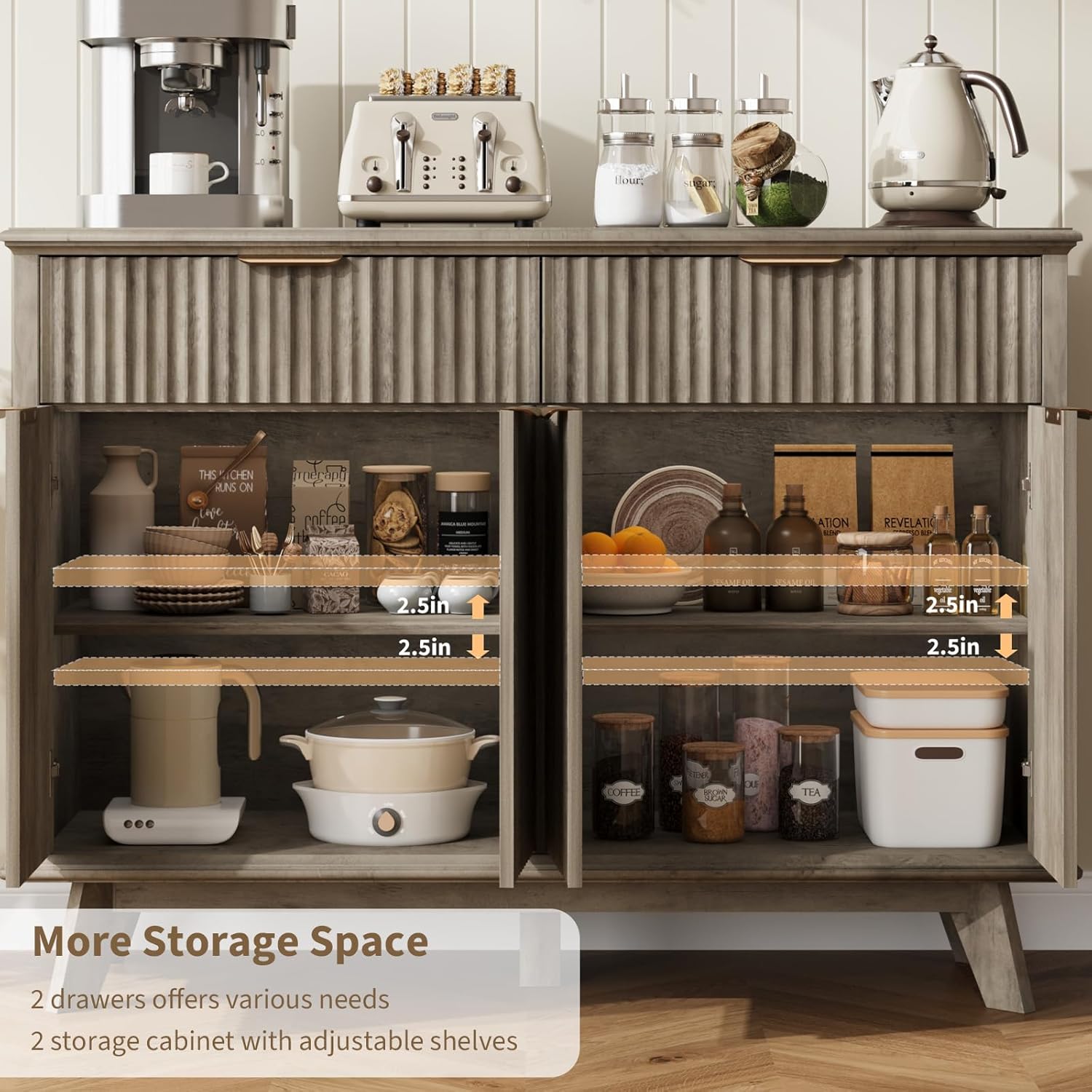 QUW Fluted Buffet Sideboard Cabinet with Storage, 47.2" Kitchen Cabinet with Drawers and Adjustable Shelves, Modern Coffee Bar with Charging Station, for Dining Room, Living Room, Grey