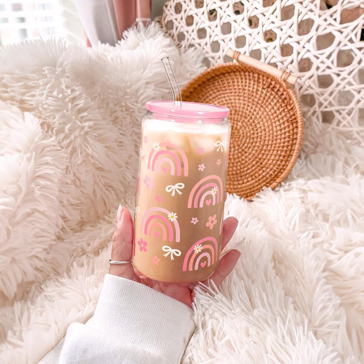 Rainbow 16oz Can Glass Tumbler with Acrylic Lid & Straw, Iced Coffee Cup for Women Girls, Aesthetic Cups Gifts for Birthday Christmas