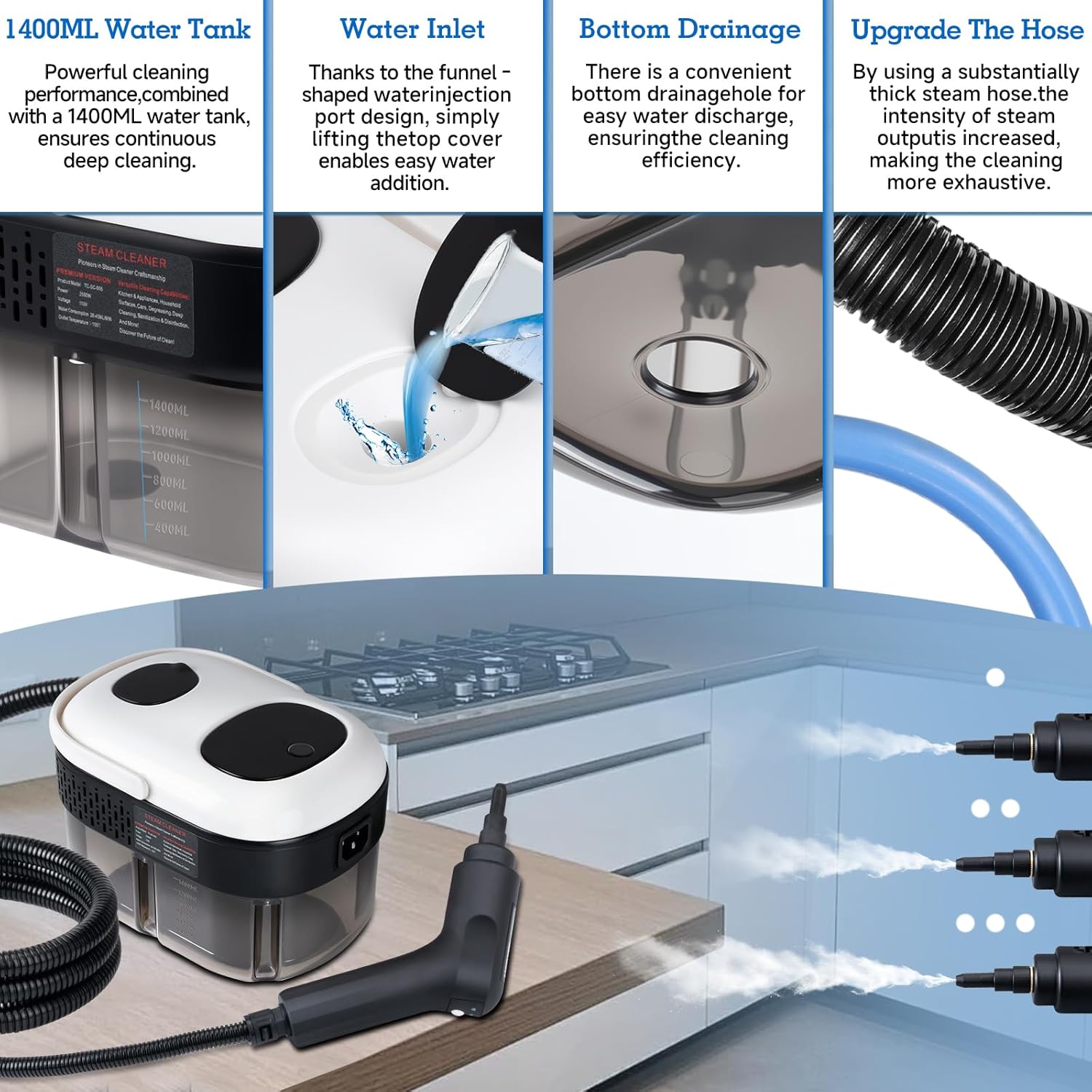 - Steam Cleaner Design: This home steam cleaner features a 1400ML high-capacity tank (45 mins runtime) with top-flip filling for splash-free refills and bottom drainage for easy water disposal. The 78.74 inch extended hose effortlessly reaches ceilings, shower stalls, and under furniture—50% longer than standard models. Paired with anti-leak seals and ergonomic handles, it delivers uninterrupted deep cleaning from floors to high walls without refill hassles.