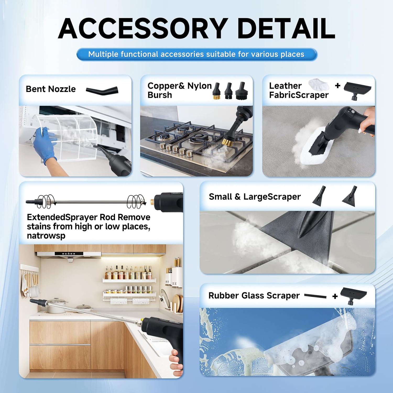 - Steam Cleaner Portable: Multipurpose steam cleaner features a reinforced 78-inch steam hose and 78-inch power cord when tackling stoves, windows, upholstery, and hard-to-reach areas like car interiors. The 9×6×7-inch compact body stores easily yet delivers. Equipped with professional accessories including brass/nylon brushes, extension rod, a glass brush, a microfiber pad, cleaning towels, and gloves, making it commercial-grade cleaning results, allowing you to clean from a distance with ease.