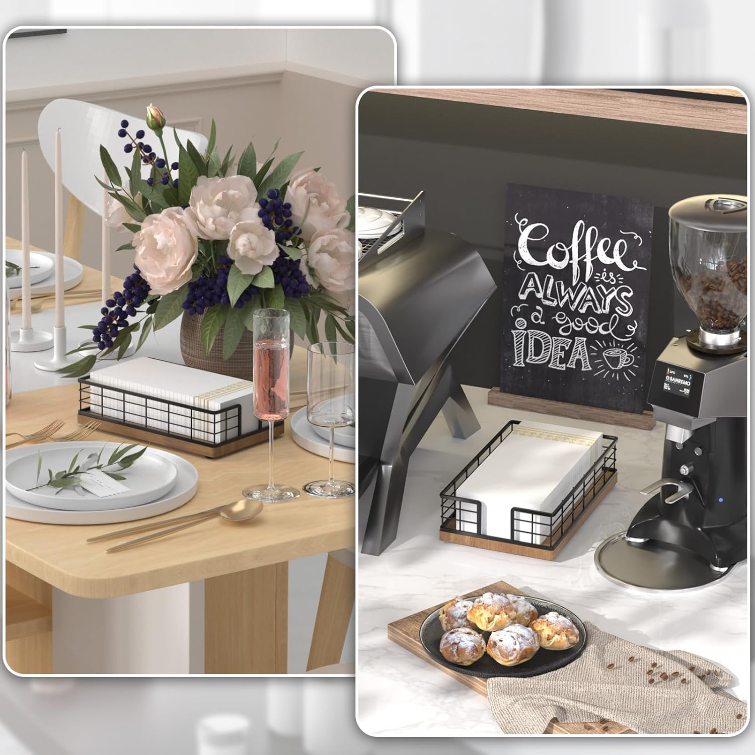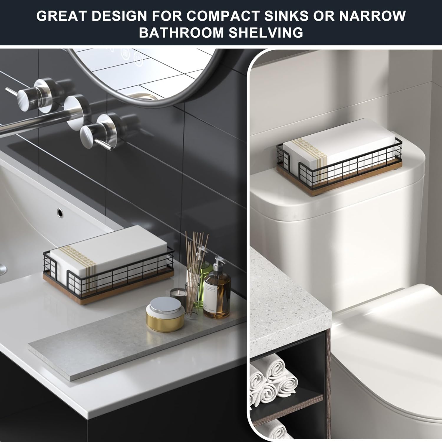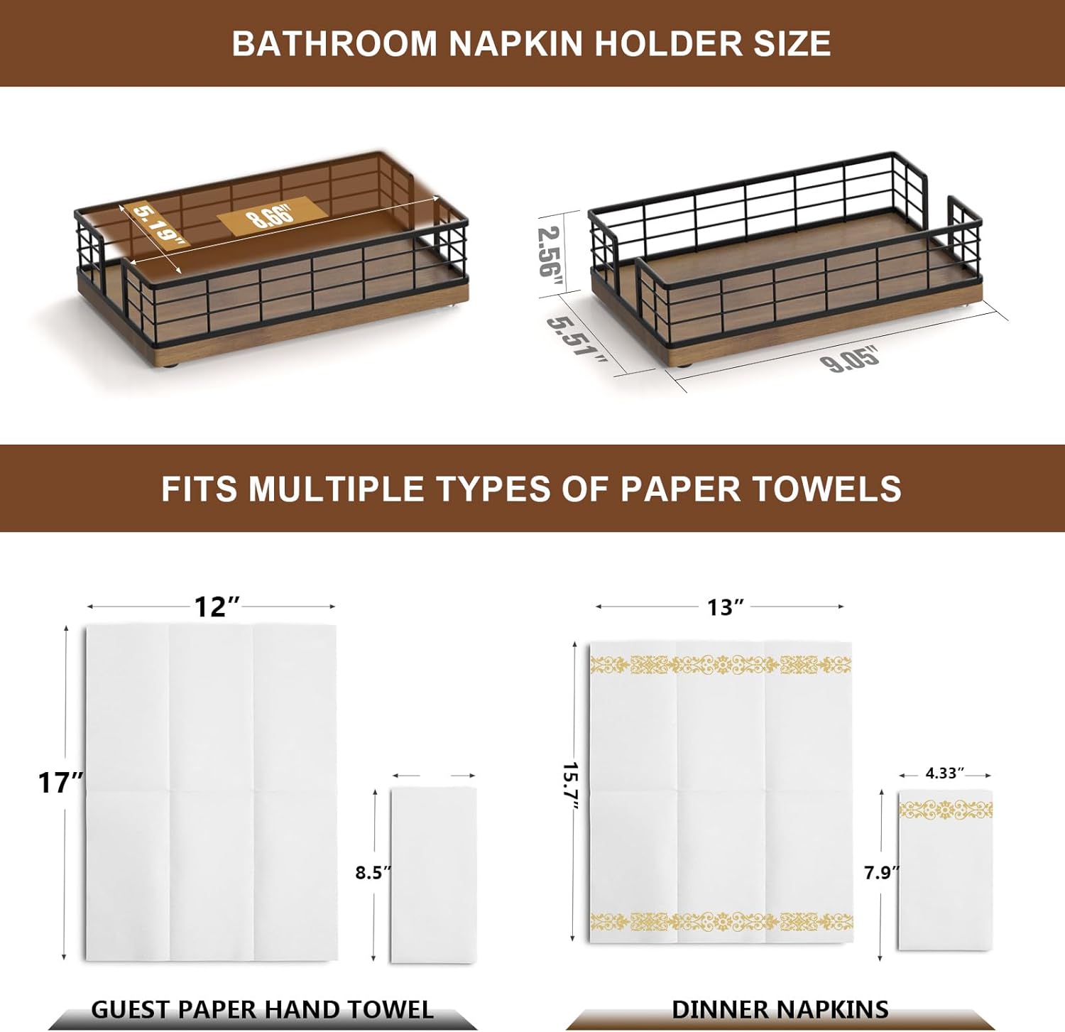 Wican Guest Towel Holder Tray for Bathroom, Oak and Iron Napkins Holder for Powder Room Dinning Table Wooden Basket for Disposable Paper Hand Towels Black and Brown