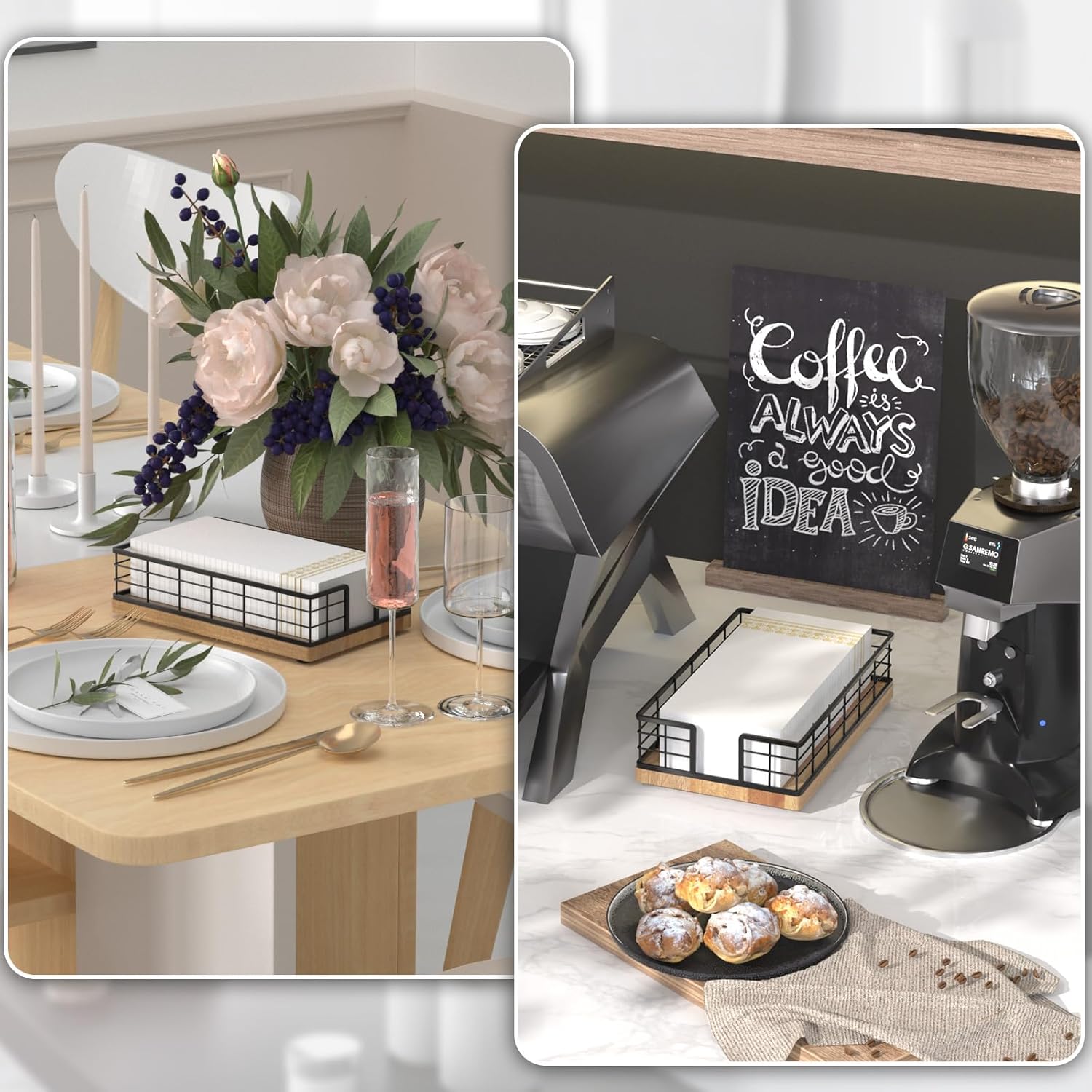 Wican Guest Towel Holder Tray for Bathroom, Acacia and Iron Napkins Holder for Powder Room Dinning Table Wooden Basket for Disposable Paper Hand Towels Black and Acacia