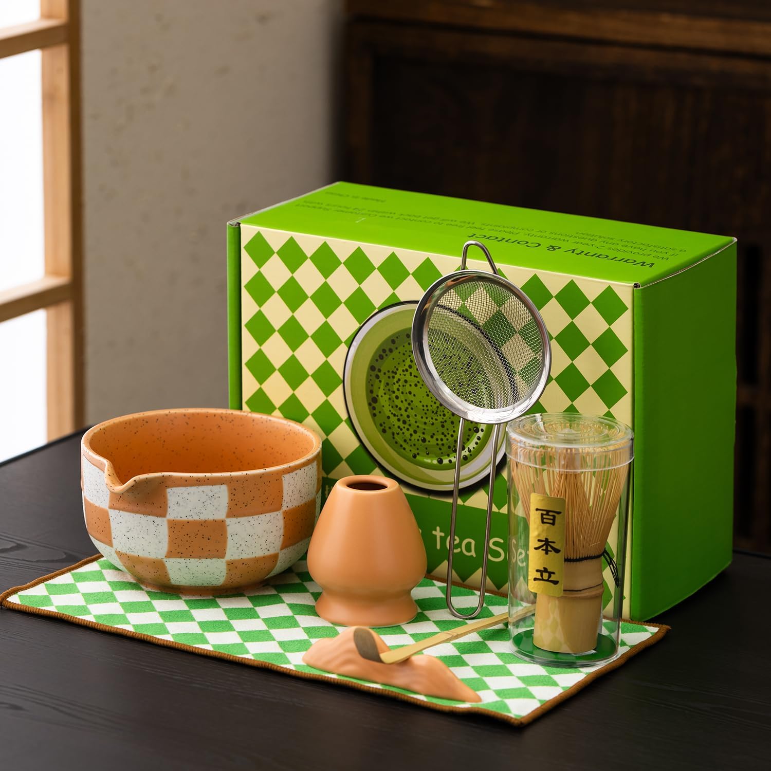 Premium 7-Piece Matcha Tea Set – Traditional Japanese Style with Elegant Grid Pattern, Includes Bamboo Whisk, Ceramic Bowl, Scoop & More – Perfect for Matcha Lovers & Tea Ceremony (Orange grid)