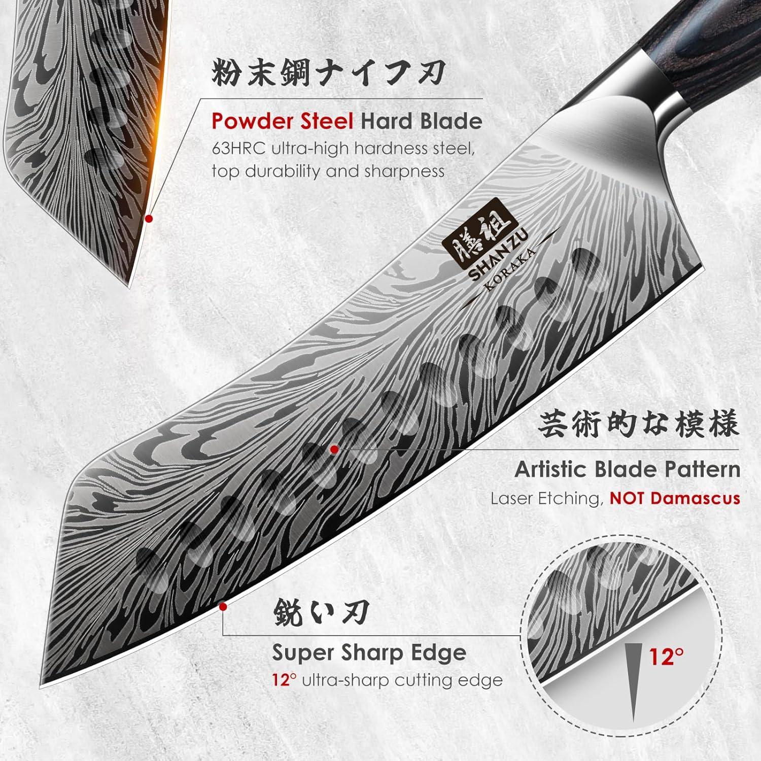 - Powder Steel Japanese Santoku Knife: SHAN ZU kitchen knife is made of high-carbon Japanese powder steel with a hardness of 63HRC which is harder than 99% of ordinary steels, and processed in advanced metallurgy technology to deliver superior durability and rust resistance. So you will get an outstanding Kitchen Santoku knife