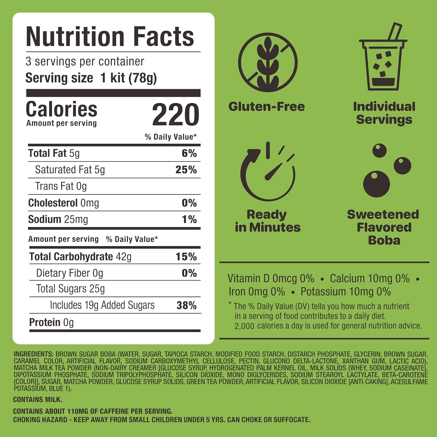 - CONVENIENT AND EASY - Forget large batches, using bubble tea machines or washing pots & pans to make bubble tea. Take a Pearl set to the office or school for an easy snack, or stock up your pantry for at home use! WHAT IS INSIDE- 3 Individually wrapped portions of brown sugar flavored pearl, 3 matcha milk tea packets, & 3 extra wide paper straws. Store in a cool, dry place (no refrigeration necessary).