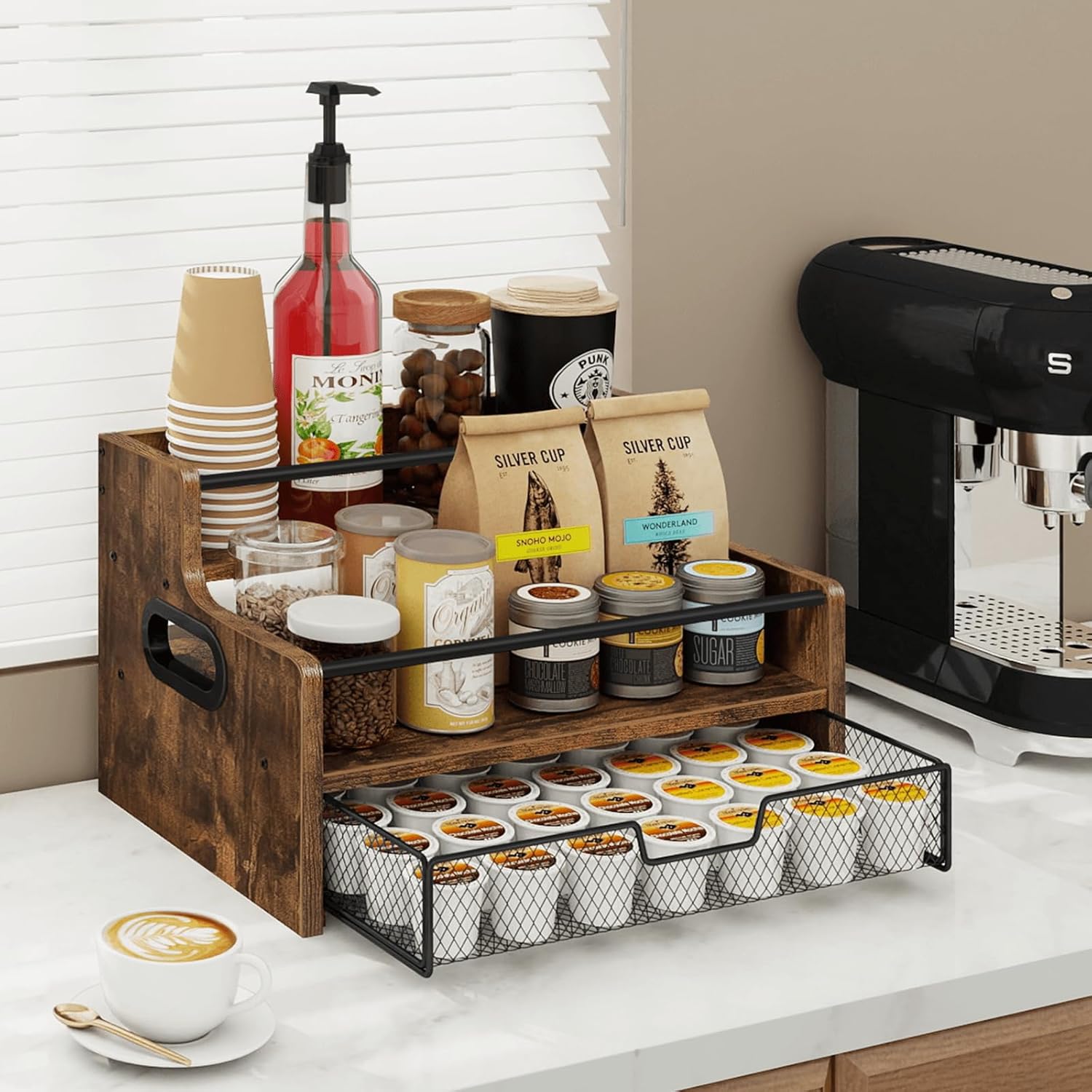 - Upgraded Coffee Syrup Rack: This 3 tier coffee station organizer combines vertical storage with a pull-out drawer. It holds 8 syrup bottles on stepped shelves and accommodates 35 coffee capsules neatly tucked below. It takes up minimal space while maximizing vertical space. The compact design fits well in any countertop, desktop or café