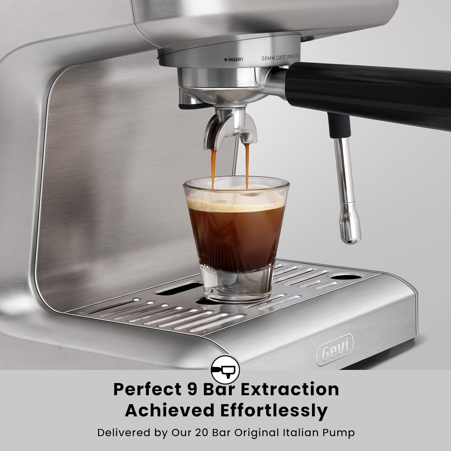 - 𝐏𝐫𝐨𝐟𝐞𝐬𝐬𝐢𝐨𝐧𝐚𝐥 𝟐𝟎 𝐁𝐚𝐫 𝐏𝐫𝐞𝐬𝐬𝐮𝐫𝐞 𝐒𝐲𝐬𝐭𝐞𝐦 - With a 20-bar professional Italian pump, the Gevi espresso machine provides optimal espresso extraction, making the espresso more fragrant and rich in crema. Equipped with a built-in pressure gauge, you can monitor the extracting pressure in real time, allowing you to make adjustments based on your personal preferences.