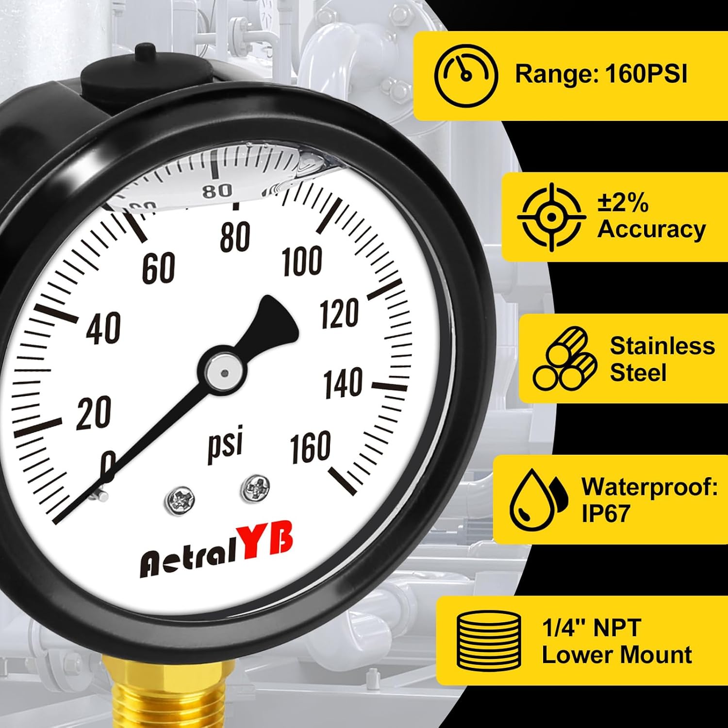 - 【IP67 WATERPROOF】The pressure gauge with an IP67 waterproof grade, which means it is protected against water infiltration and fogging of the window, providing a clear reading.