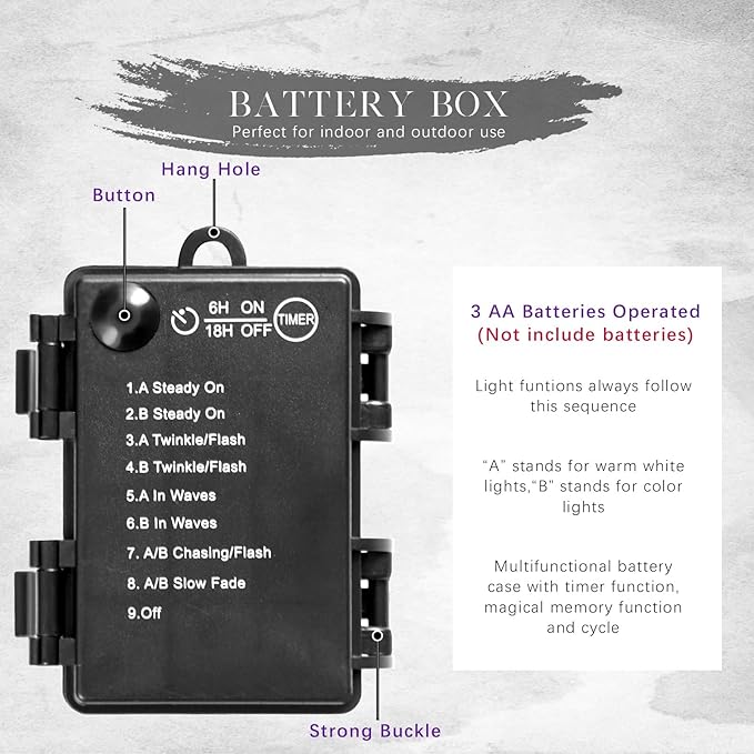 - 🎃 PRE-LIT MAGIC - 25 energy-efficient LED lights (warm white + multicolor) with 8 dynamic lighting modes! Battery-powered (3 AA required, not included) and featuring a convenient timer button for instant, mesmerizing ambiance. Cast a spellbinding glow for trick-or-treaters or set a playful party mood.