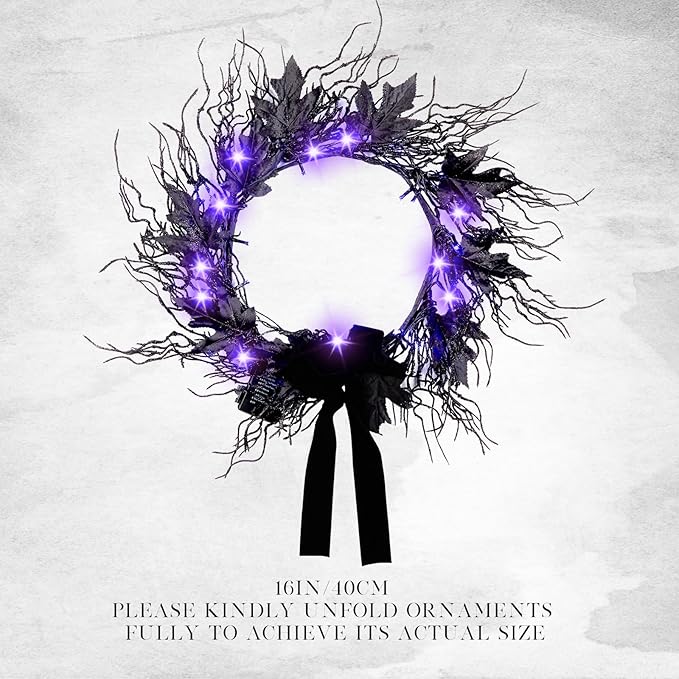 - 🎃 PERFECT PROPORTIONS - This 16-inch black Halloween wreath delivers classic spooky vibes in an ideal door-ready size. Featuring eerie black maple leaves and integrated color-changing lights, it effortlessly elevates your haunted entryway or mantel while embodying Halloween’s signature dark allure.