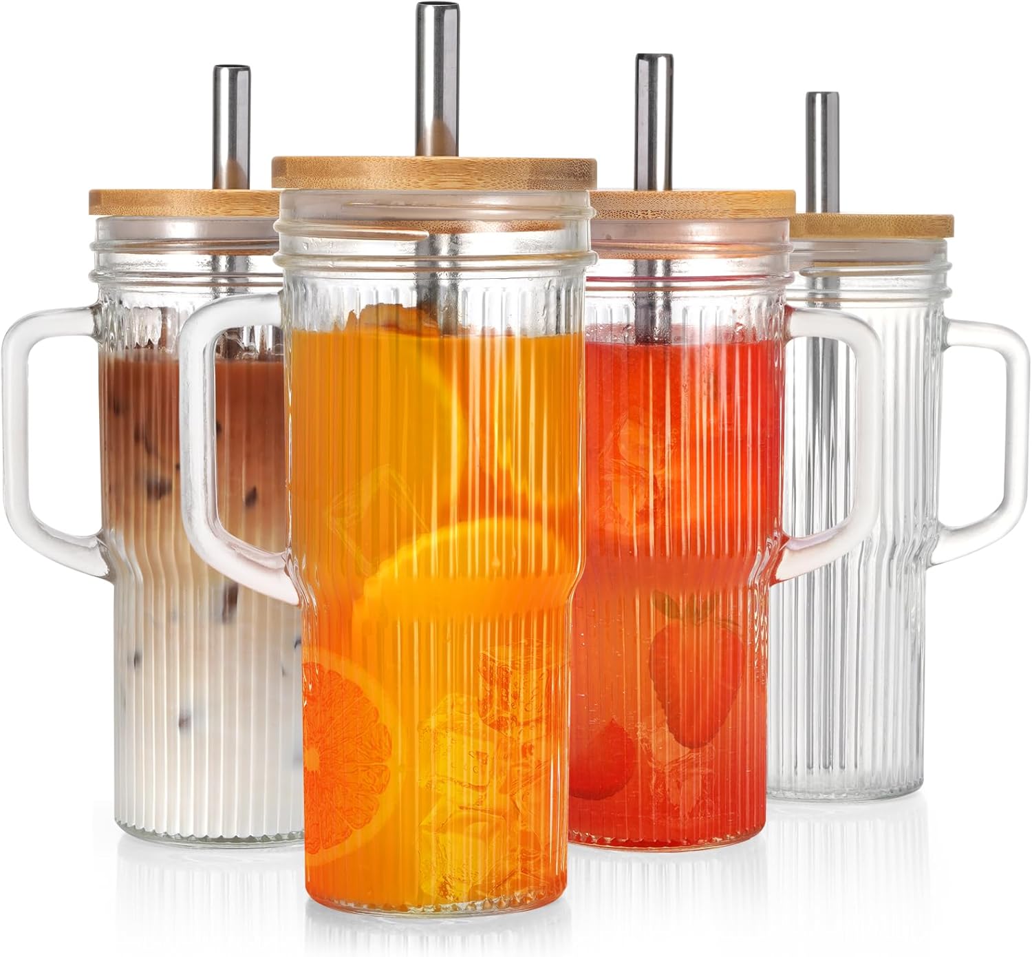 24Oz Ribbed Glass Tumblers with Lids and Straws, Glass Tumbler with Handle, Vintage Glass Cups Thick Drinking Glasses Set of 4, Ideal for Iced Coffee, Smoothies, Cocktails, Tea and Juices