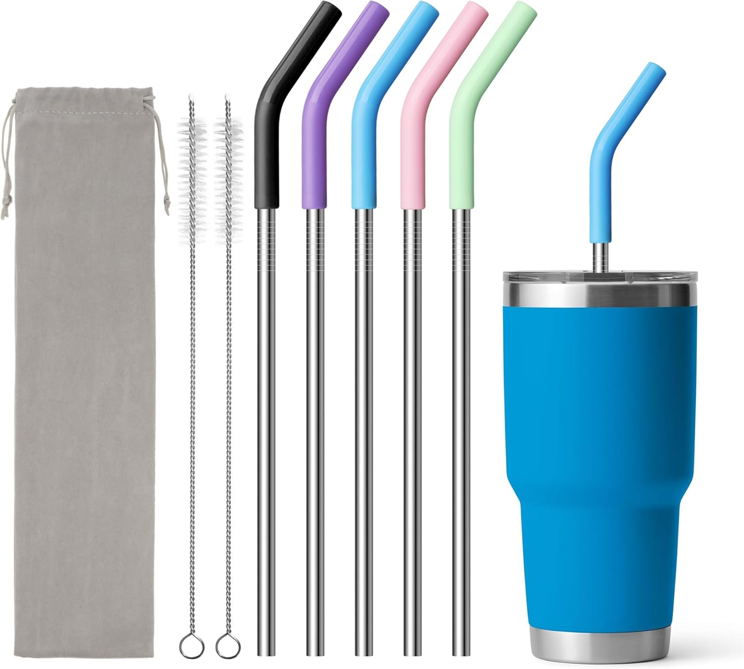 Metal Straws Reusable With Silicone Tips, 9.5" Stainless Steel Straight Drinking Straw for Yeti 30 oz Tumbler- 2 Cleaning Brushes & 1 Portable Bag