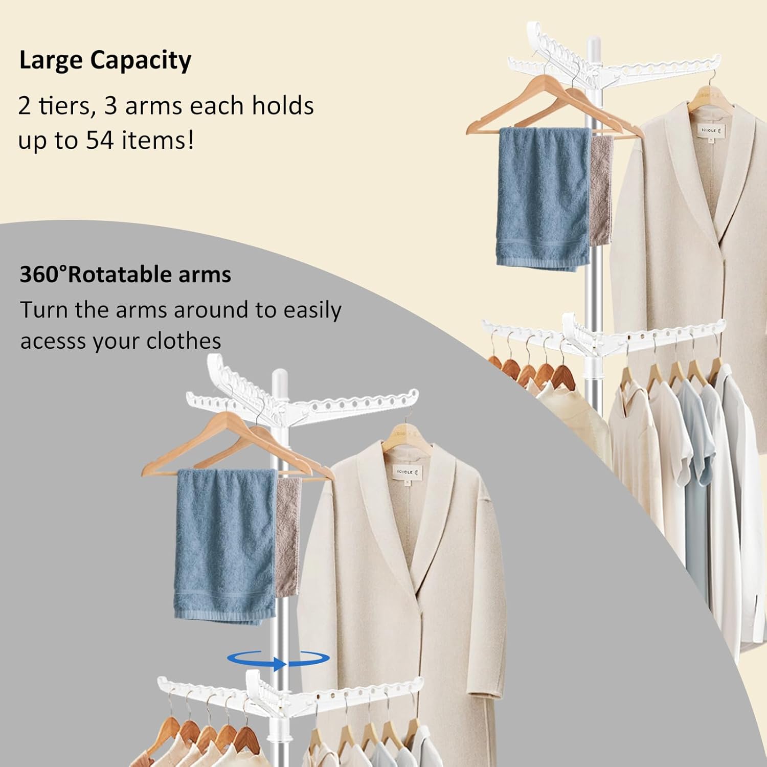 - [360-Degree Independent Rotation]Both tiers of the SUYU drying rack rotate independently, providing easy access to all your clothes. This feature simplifies the hanging and retrieval process, making it a convenient addition to any space.