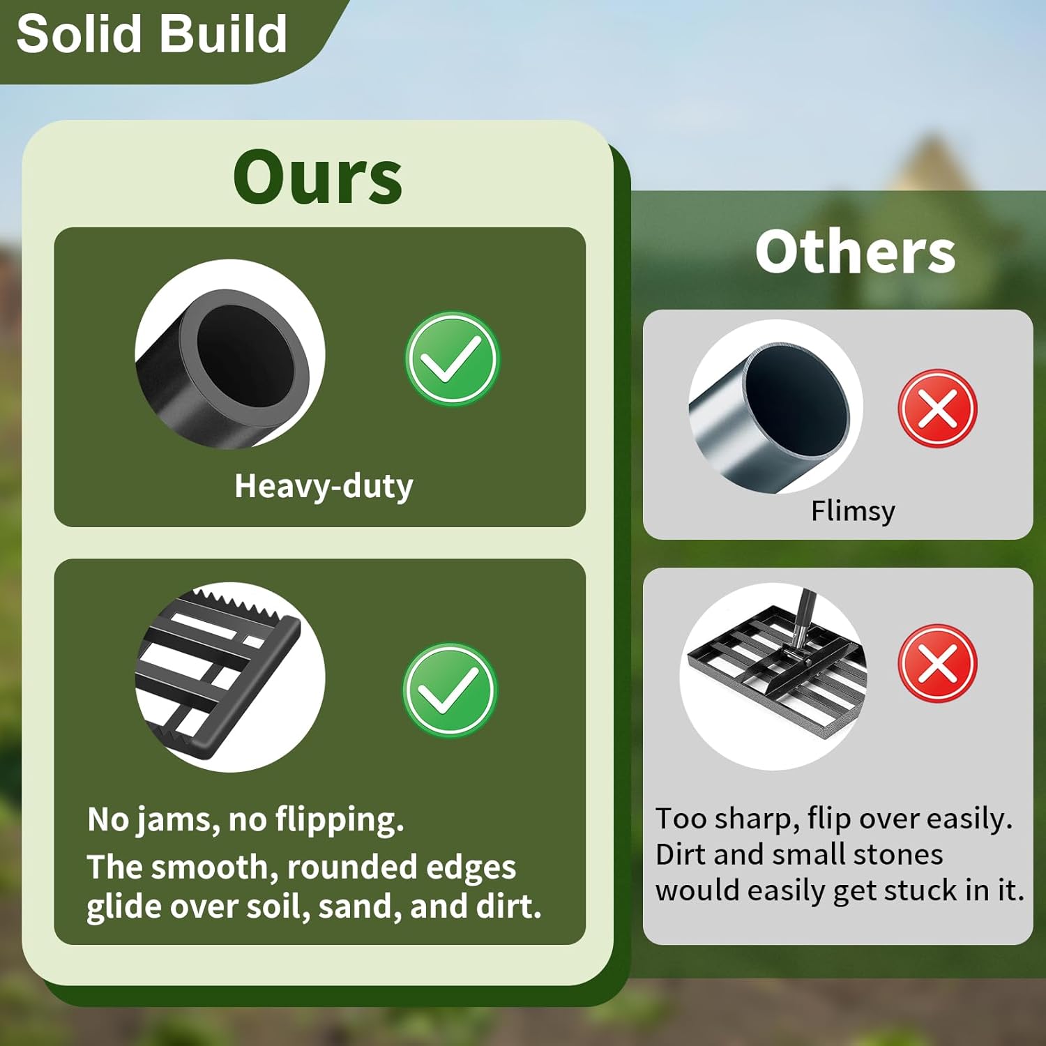 - Smooth & Stable Operation: The lawn leveling tool is designed to prevent flipping and ensure better balance, this landscape tools rake helps you finish leveling jobs faster, smoother, and with less effort.