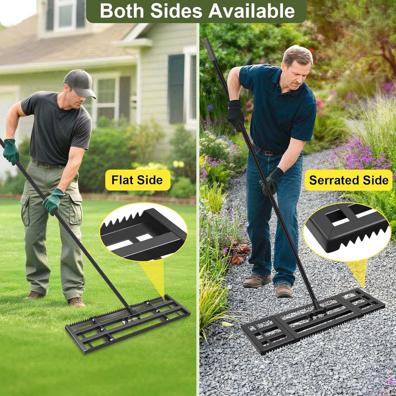 - Dual-Sided Design: This lawn leveling rake features a flat side for smooth soil gliding and a serrated edge for breaking up tough clumps! Saving you time and effort. Ideal for soil spreading, seeding, turf repair, sand leveling, and gravel smoothing.