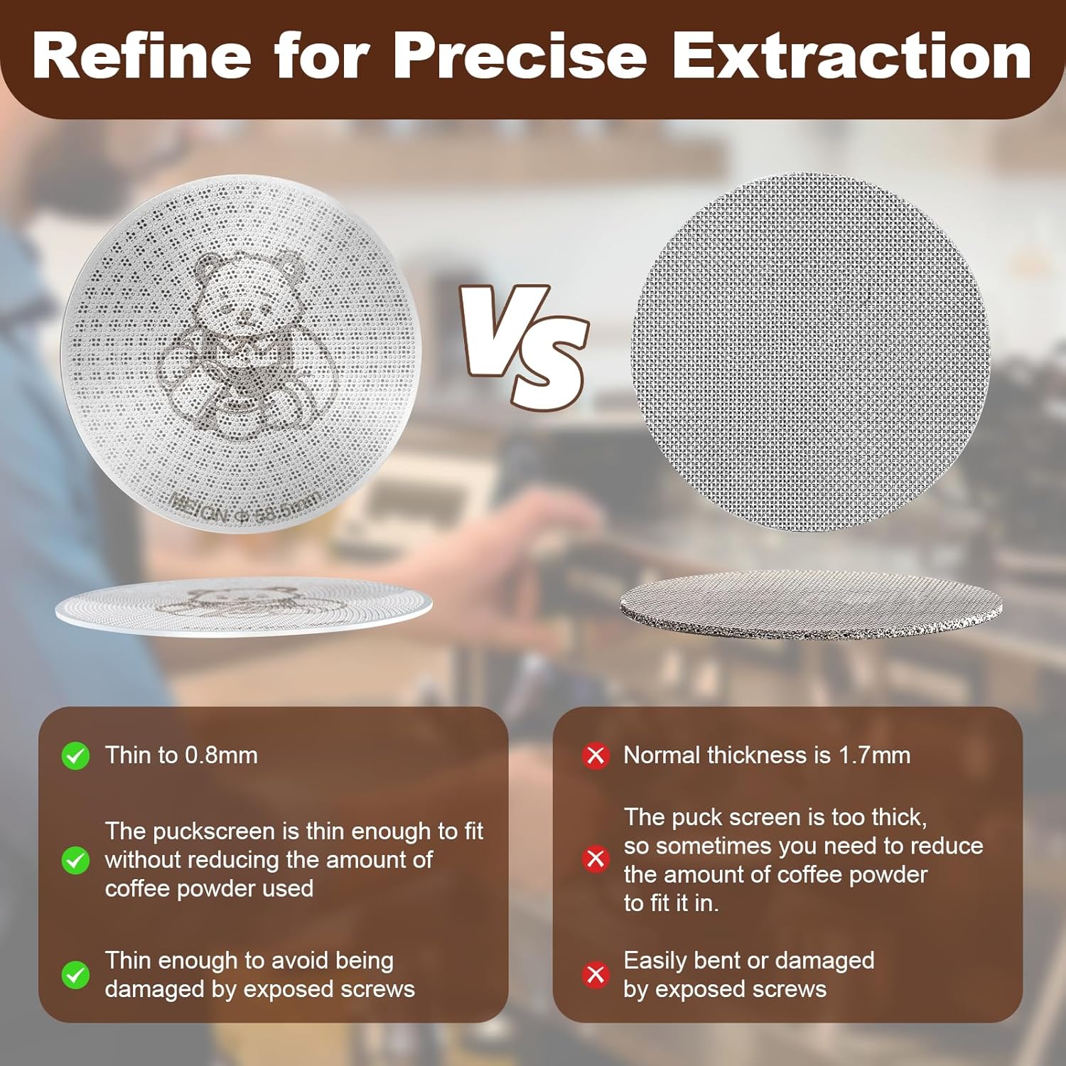 - 【Improved performance】0.8mm Ultra-Thin Dual-Layer Design, MEION 58.5mm espresso puck screen features optimized perforations that evenly disperse water across your coffee pack. It prevents channeling, boosts extraction stability, and delivers barista-quality consistency in every shot.