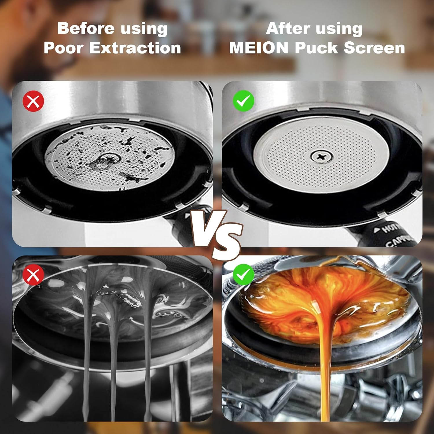 - 【Keeps Brew Head Clean】Keep your espresso machine spotless! MEION Espresso Puck Screen blocks coffee residue from reaching the brew head. Simply rinse under water after use—no scrubbing needed. 【Note:If the brewing head of the coffee machine has a ralsed nut, then the Puck Screen is mot suitable and the paper Filteris recommended.】