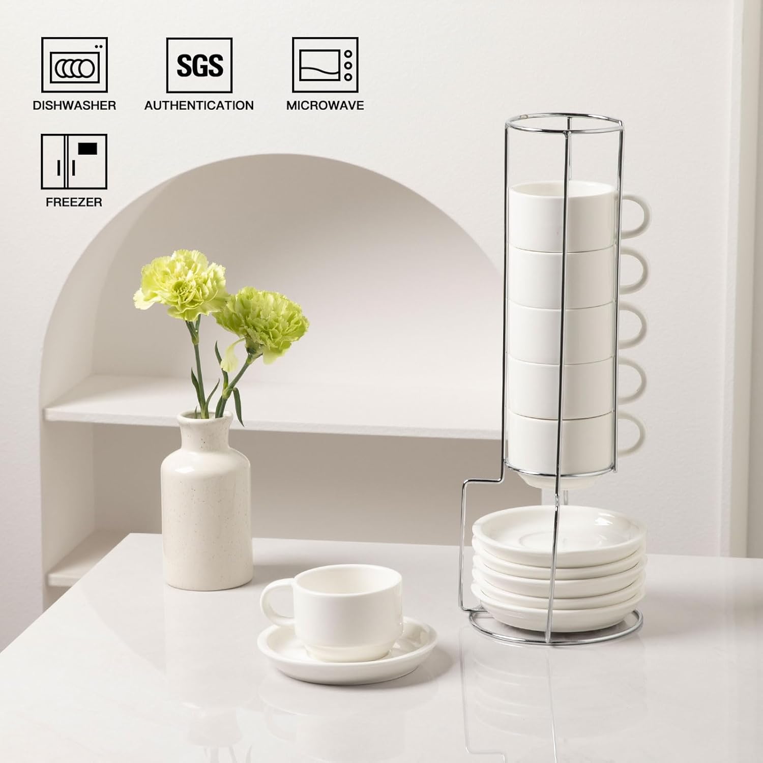 - Save Space - The cups and saucers can be stacked on top of each other in metal brackets for easy management. Save space and keep your kitchen clean. The saucer has groove that can trap the bottom of the cup. The cup doesn't slide when you carry it around.