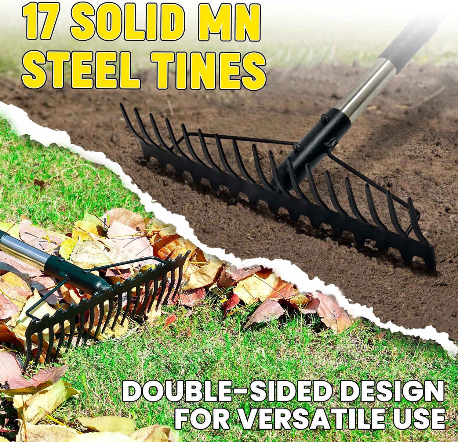 Bow Rake, 68-Inch Adjustable Handle Garden Rake with 17 Steel Tines, Heavy Duty Dual-Sided Metal Rake Landscape Gardening Tool for Soil Loosening Lawn Yard Leaves Mulch Thatch Removing