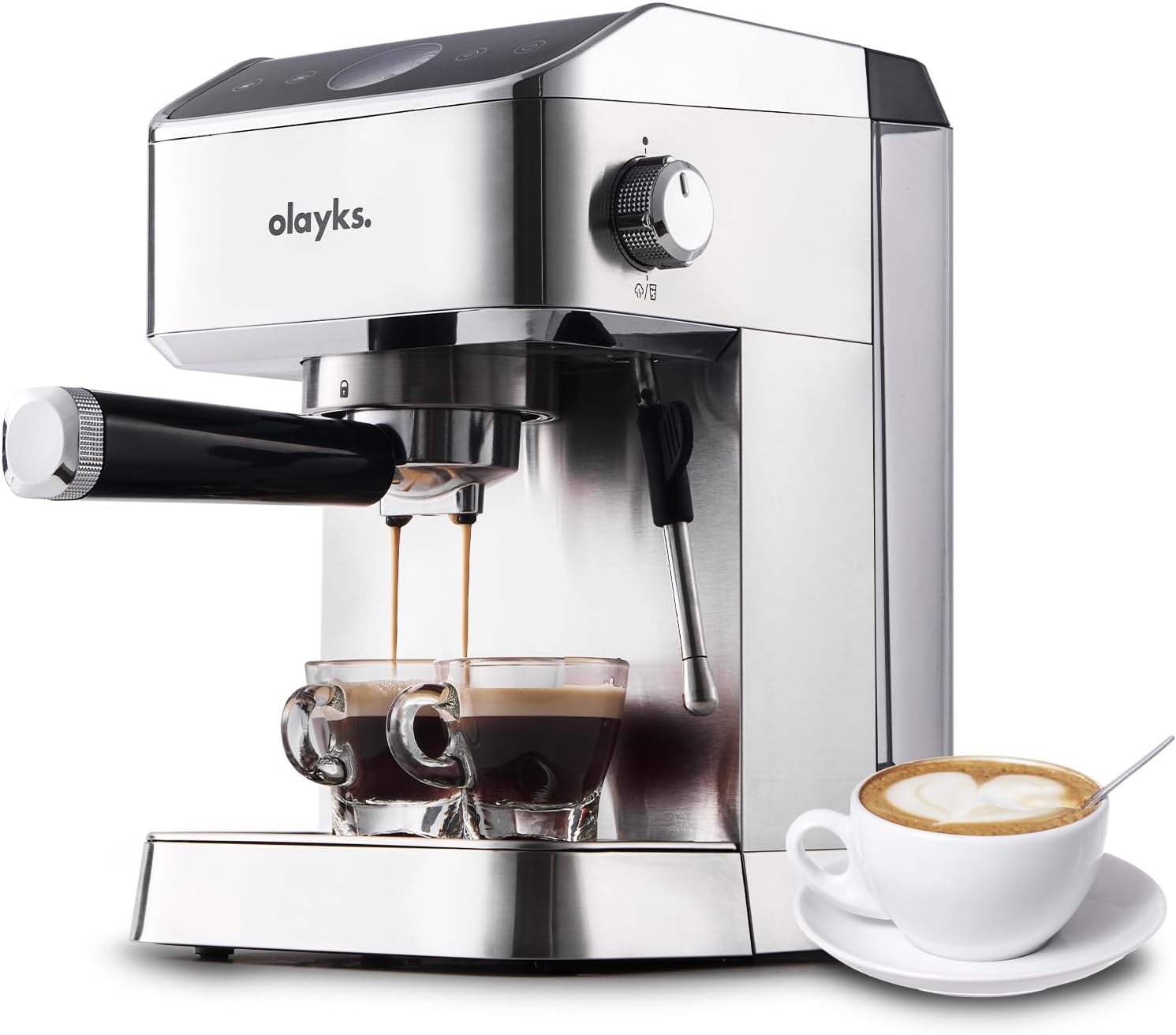 - 20 Bar Modern and Elegant Espresso Machine: Olayks espresso coffee machine uses a high-pressure pump and evenly moistened pre-infusion technology to create rich and mellow espresso for you. Its stainless steel body design also adds a touch of sophistication to your coffee corner.