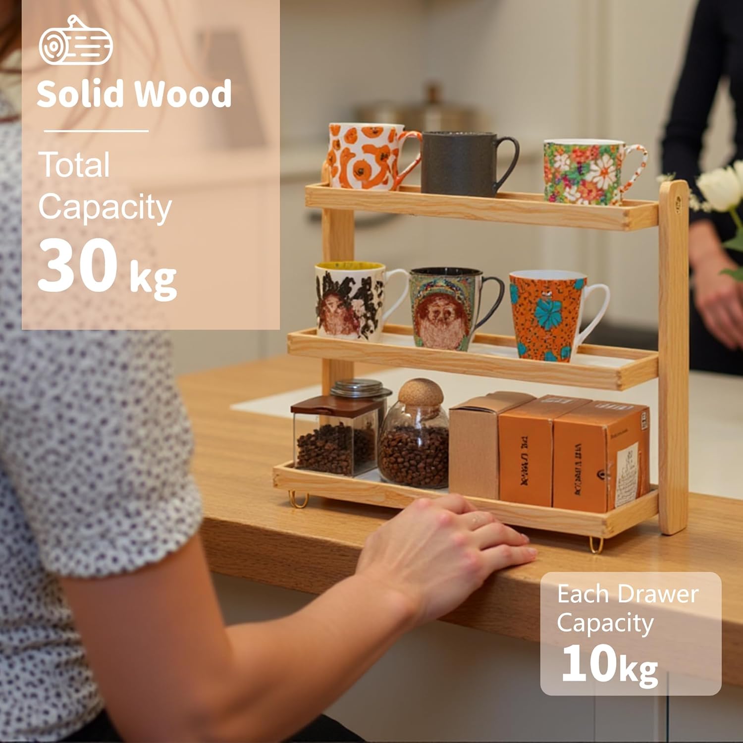 Coffee Mug Holder Wooden Cup Rack,3-Tier Acrylic Home Mug Display Rack for Kitchen Countertops Coffee Beans, Syrup, Cups, Stirrers