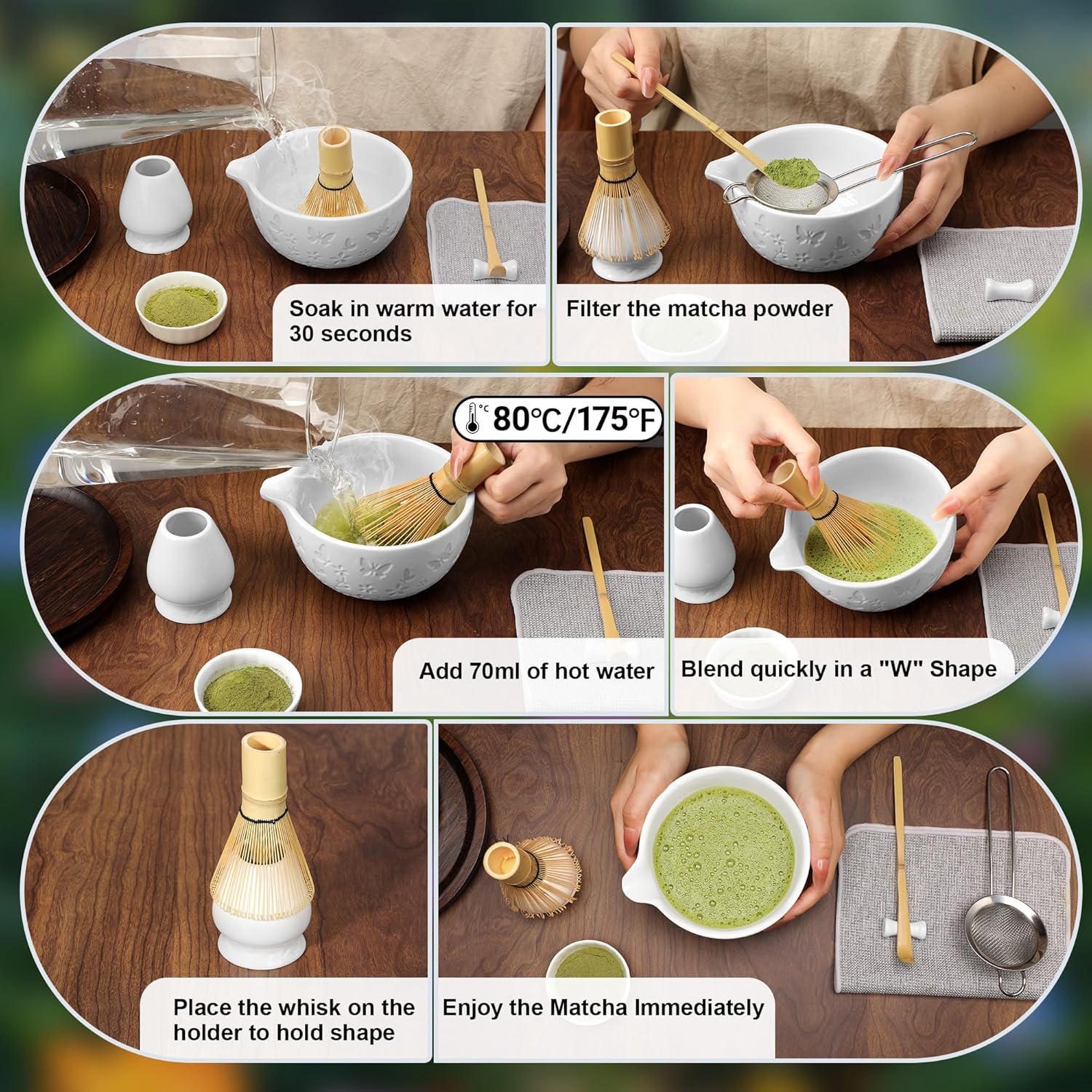 - 7Pcs Packaging: This matcha set includes the necessary tools for creating an authentic matcha experience: ceramic matcha bowl, ceramic whisk holder, bamboo matcha whisk, bamboo spoon, spoon stand, powder starter sifter, tea towel and manual. 7PCS matcha whisk set can fully meet the steps required to make matcha and enjoy a more pleasant matcha time