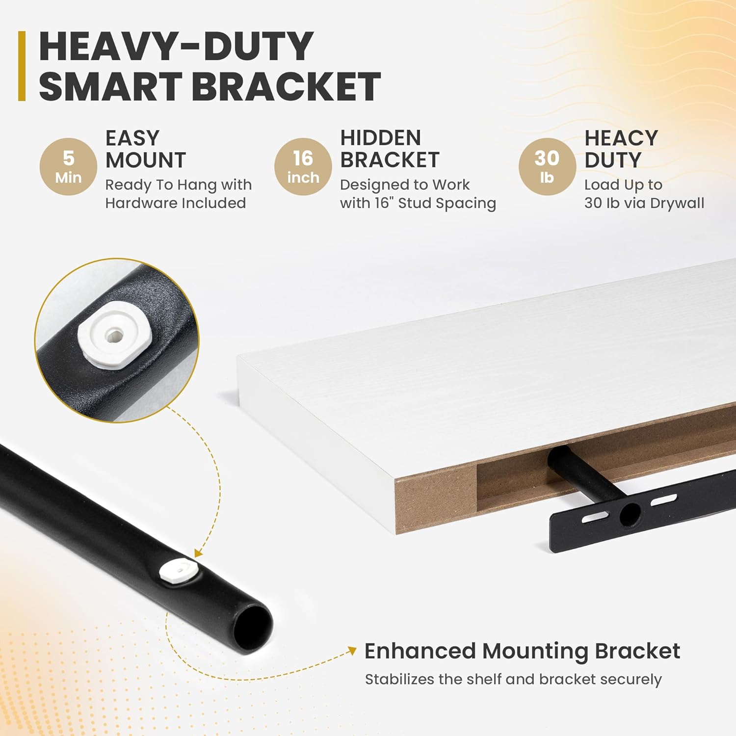- [ROBUST & SECURE MOUNTING]: Equipped with a sturdy, hidden mounting bracket, these 16-inch floating shelves ensure solid support for your items. Designed for easy and secure installation, they come with all necessary hardware for a firm, wobble-free setup, allowing you to confidently display decor, photos, or functional items with style.