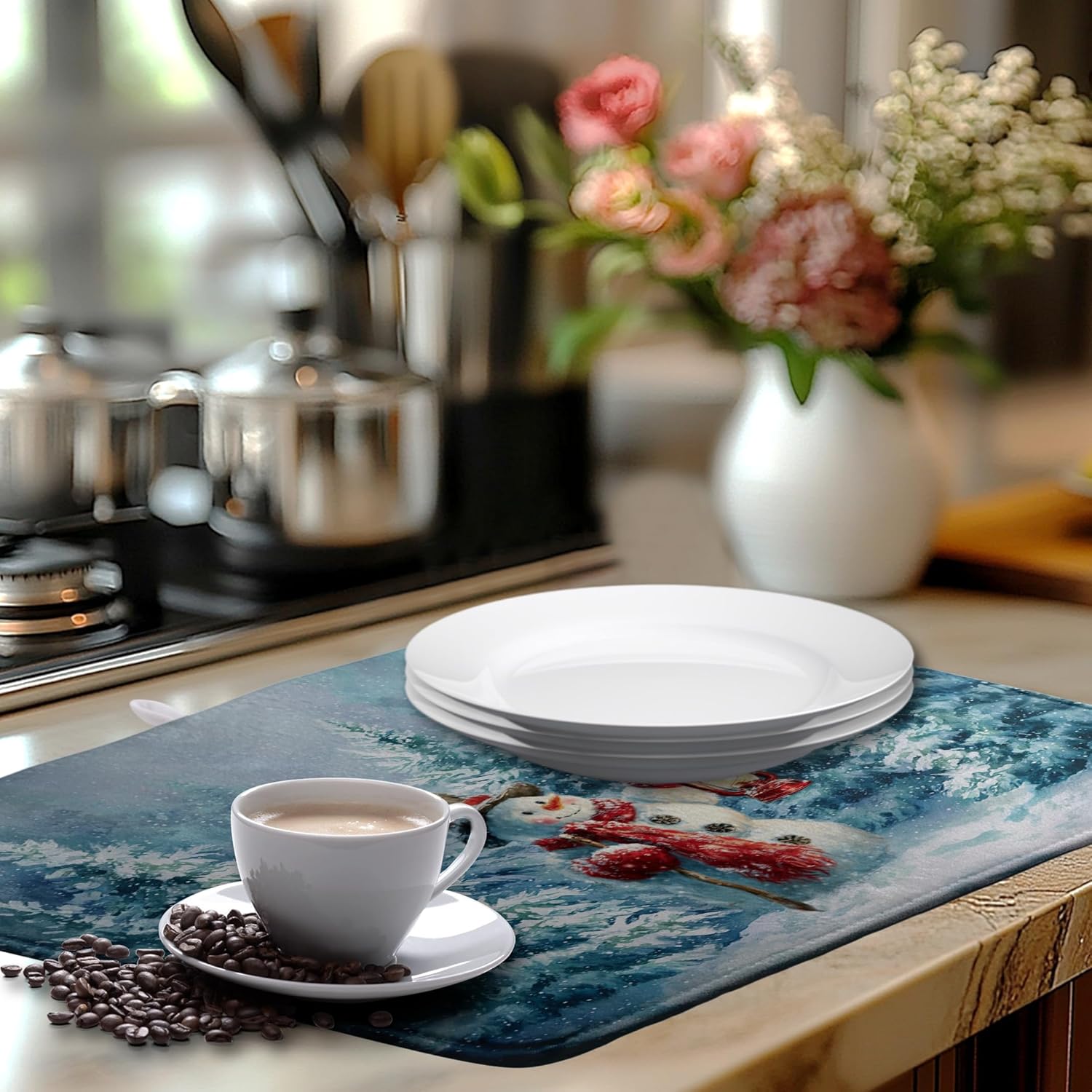 - [Multi-functional]: This Winter Blue Snowman dish drying mat can be placed under the dish rack to collect dripping water to keep the counter dry and clean, or you can place bottles, pots, plates, bowls, cups and other utensils directly on the mat. Winter Red Bird Large dish drying mat can also be placed under the coffee machine to absorb spilled coffee.