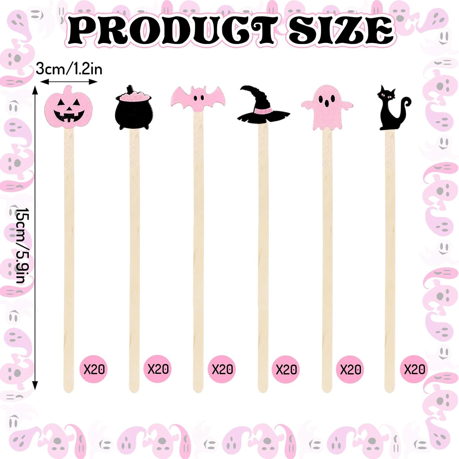 120Pcs Halloween Coffee Stirrers Disposable Pink Black Ghost Bat Cat Pumpkin Stir Sticks Wooden Drink Stirrer for Hot Chocolate Milkshake Restaurant Home Office