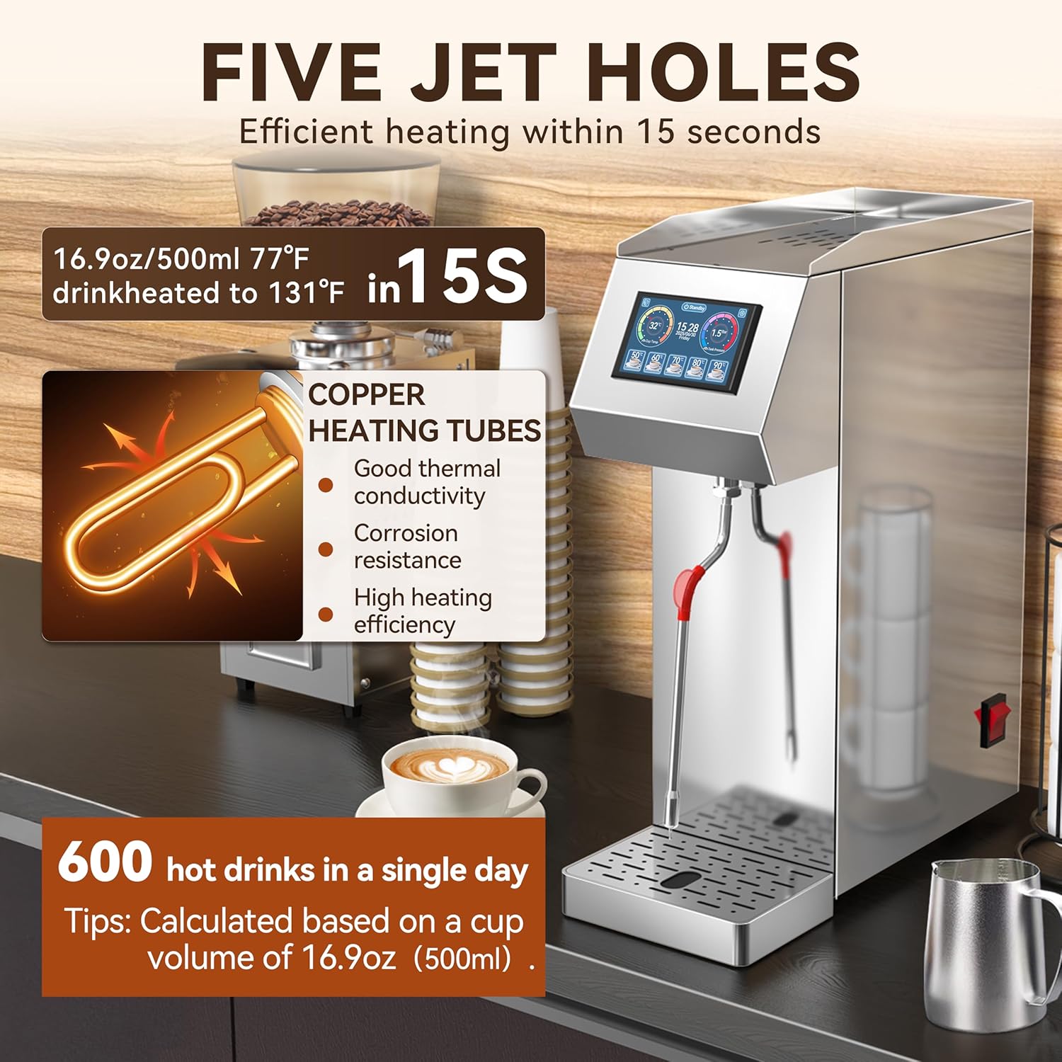 - 【Efficient Output】: The milk steamer1 comes with a 360-degree rotating five-hole nozzle, which can produce air continuously at high pressure for 20 minutes, and it only takes a few seconds to get enough steam again. At the same time the drink mixer set whipping milk foam, tea extraction, heating drinks in one, a machine to meet the diverse needs.